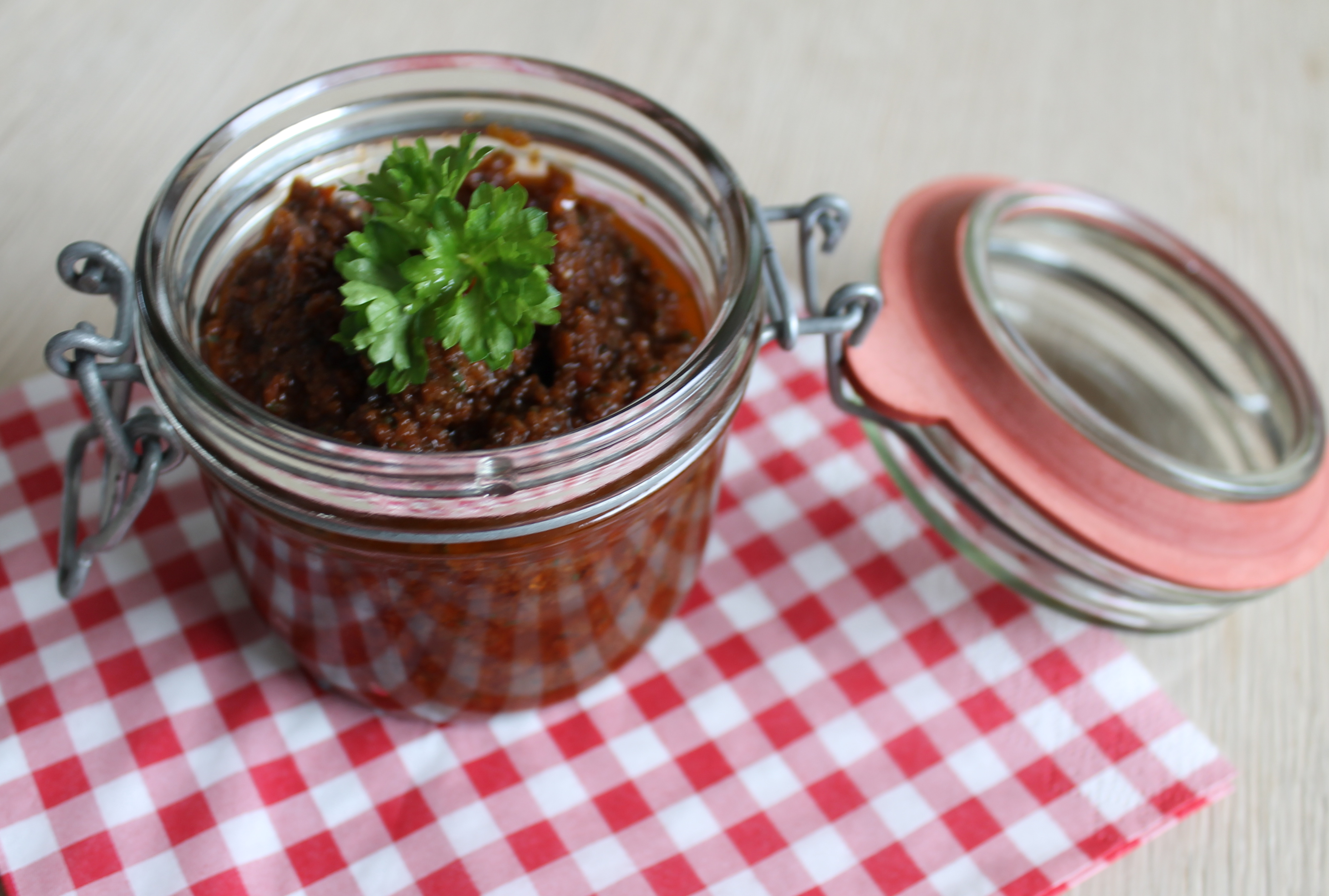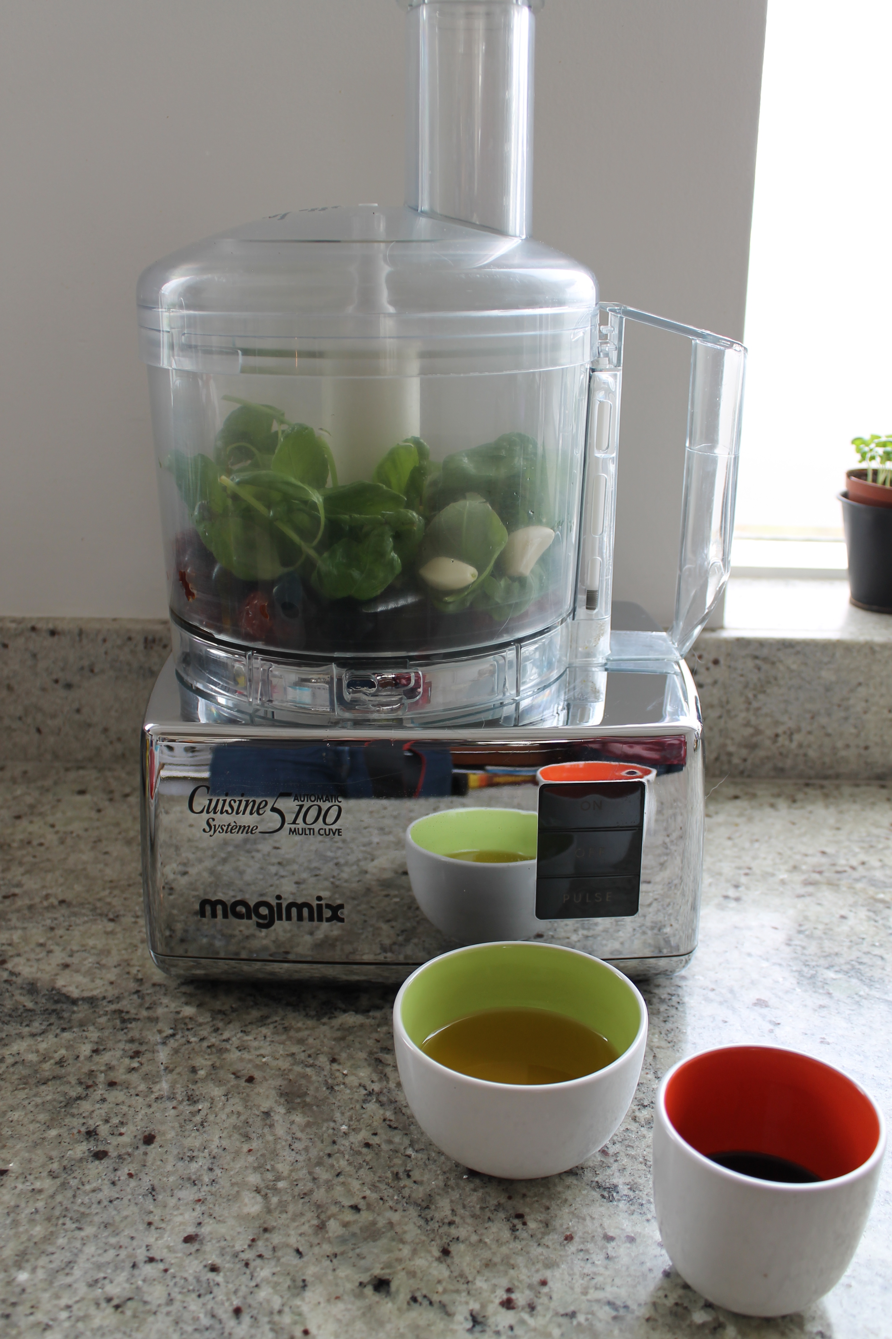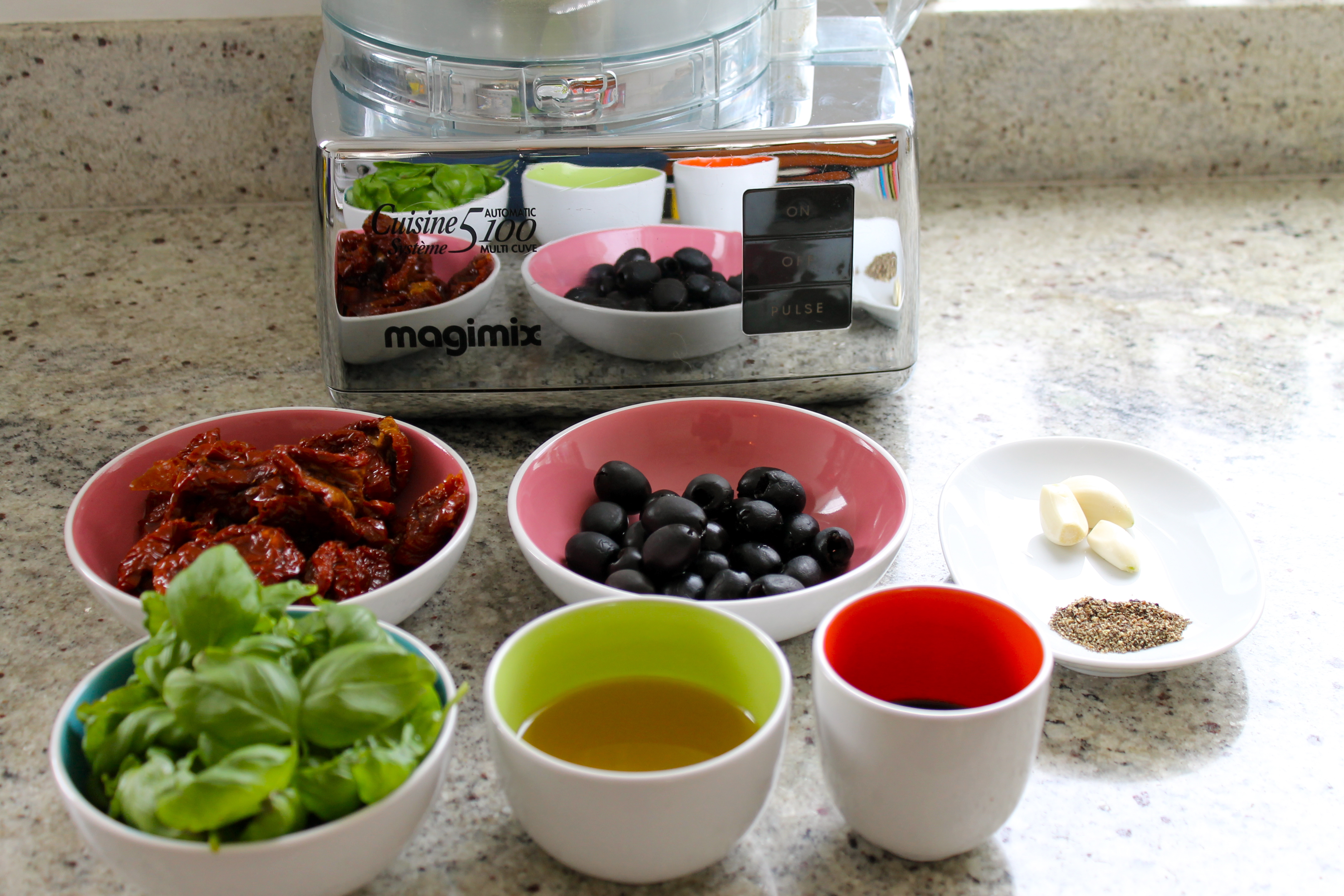 Setjið allt í matvinnsluvél nema ólífuólíuna og maukið, hellið ólífuólíunni í hægri bunu út í. Smekksatriði hveru gróft maukið er, við viljum hafa það fín-maukað. Magn ólíunnar fer líka eftir smekk, því meiri olía, því þynnra mauk.