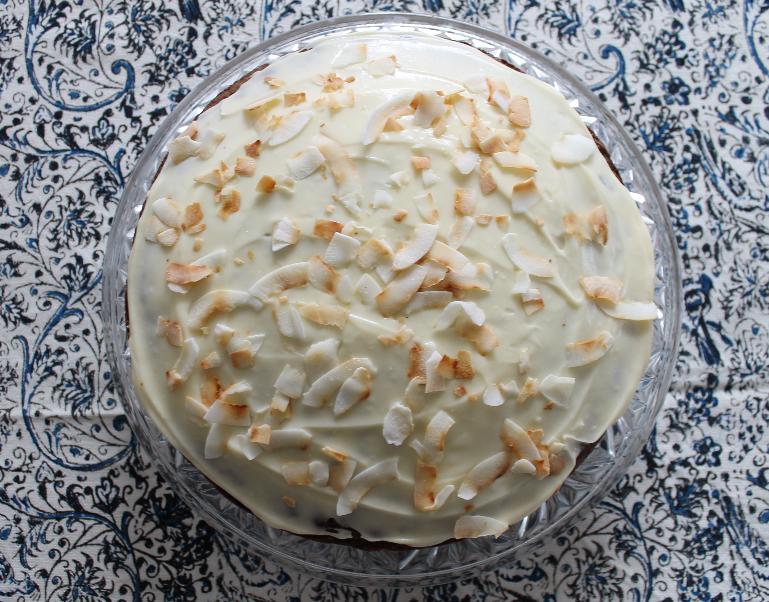 Skreytt með ½ dl. kókosflögum sem ristaðar eru á þurri pönnu og kældar áður en þeim er stráð yfir kremið á kökunni.