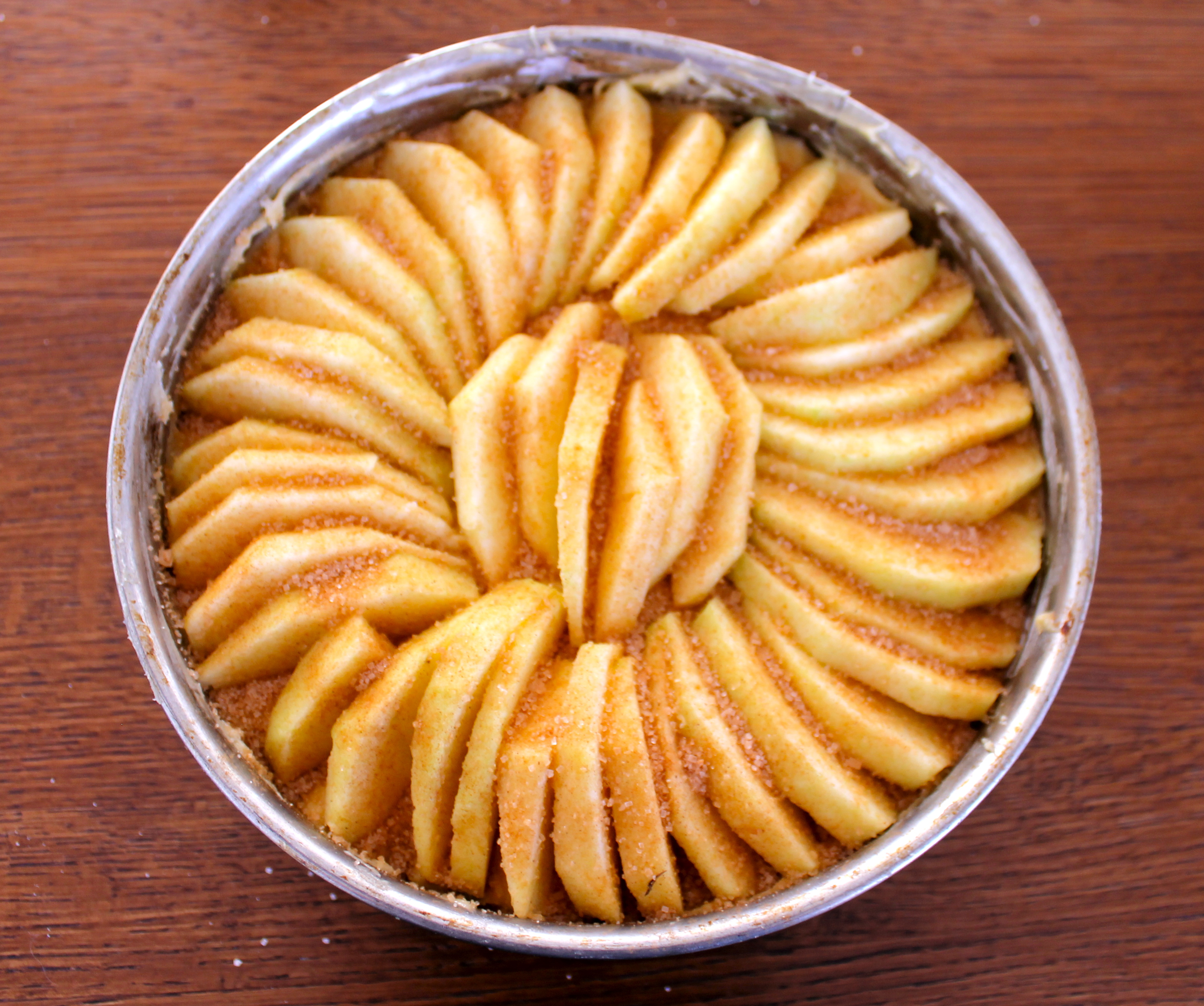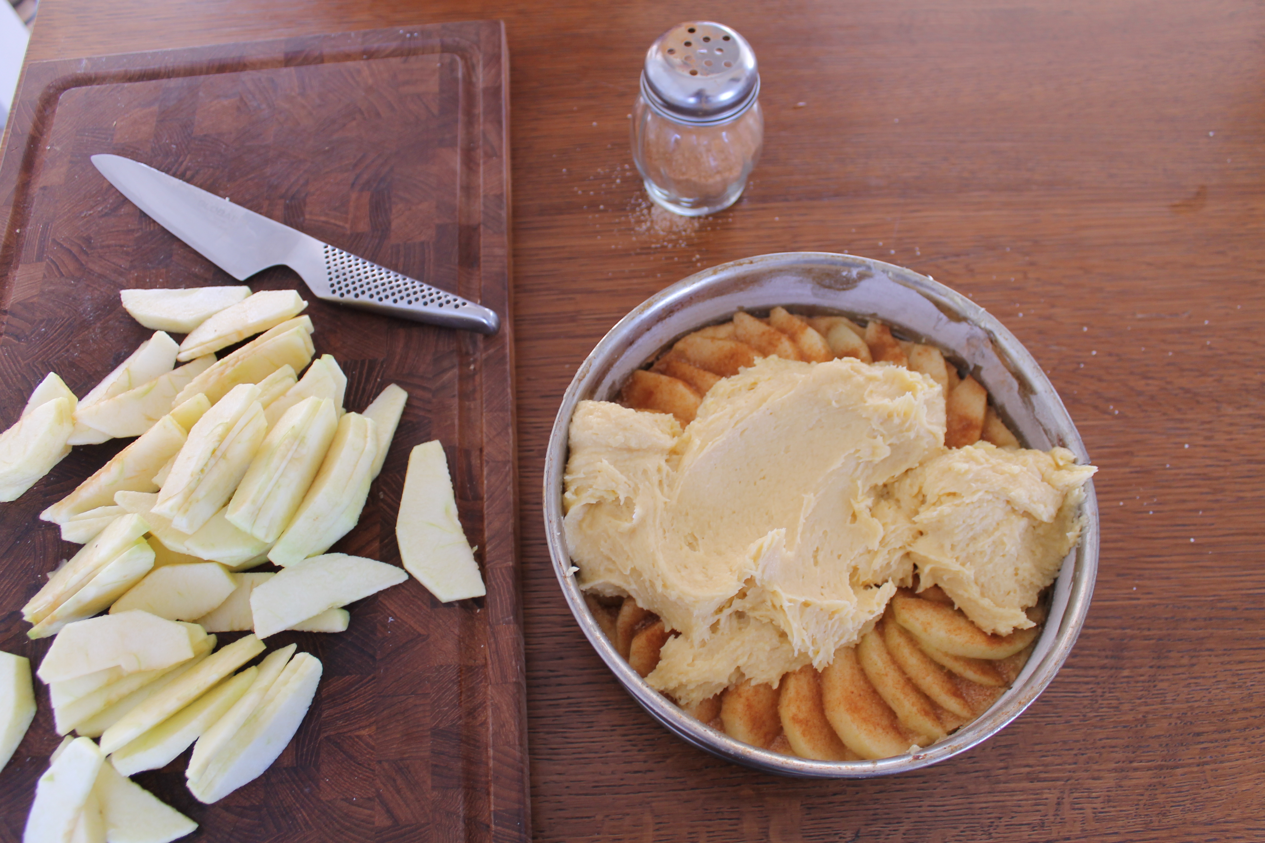 IMG_6504Raðið eplum fallega ofan á og stráið kanilsyktri yfir. Setjið afganginn af deiginu ofan á eplin og sléttið vel úr. Raðið eplum ofan á og stráðið kanilsykri yfir.