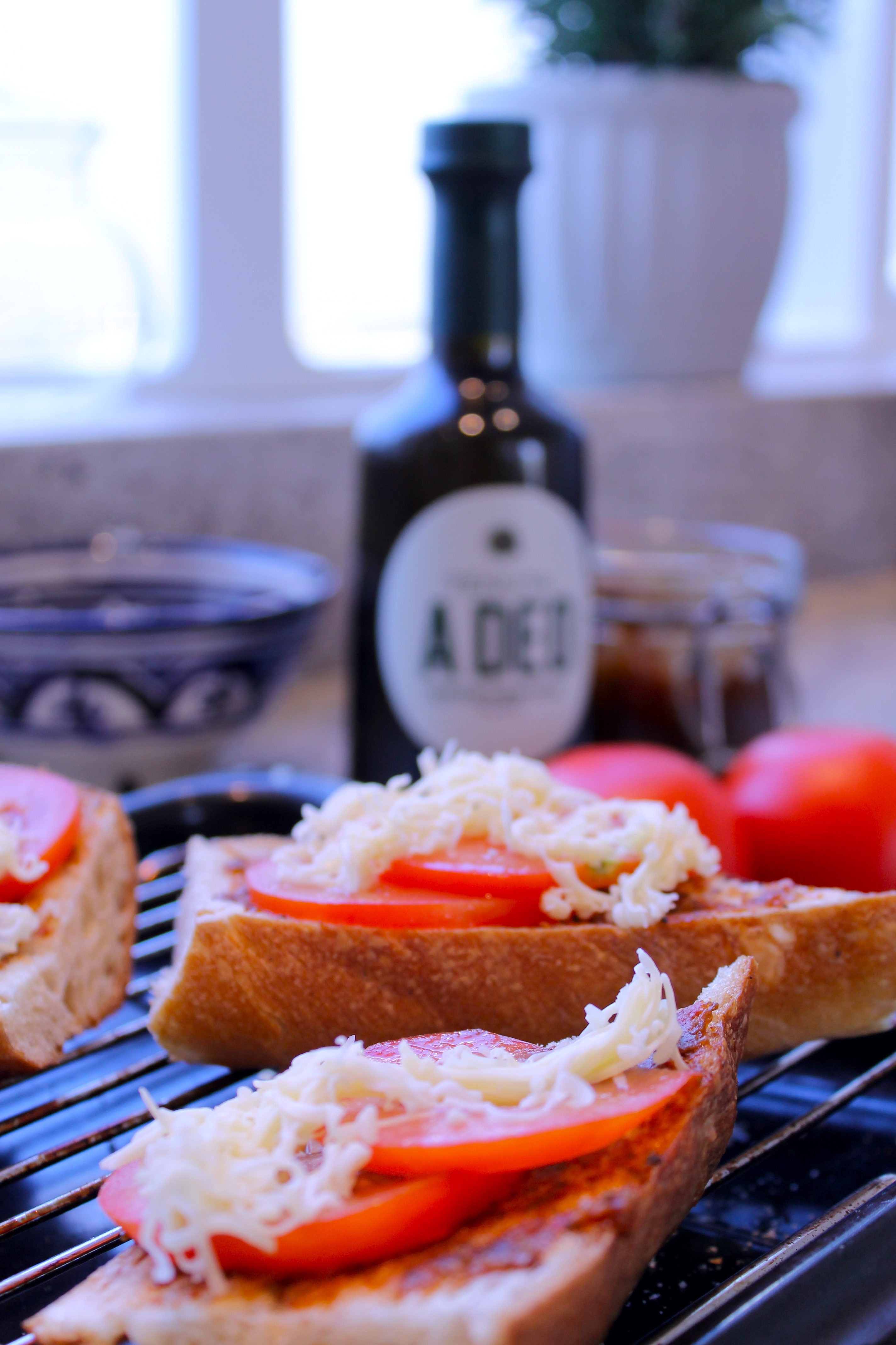 - setja 2 þunnar sneiðar af tómati á hverja sneið