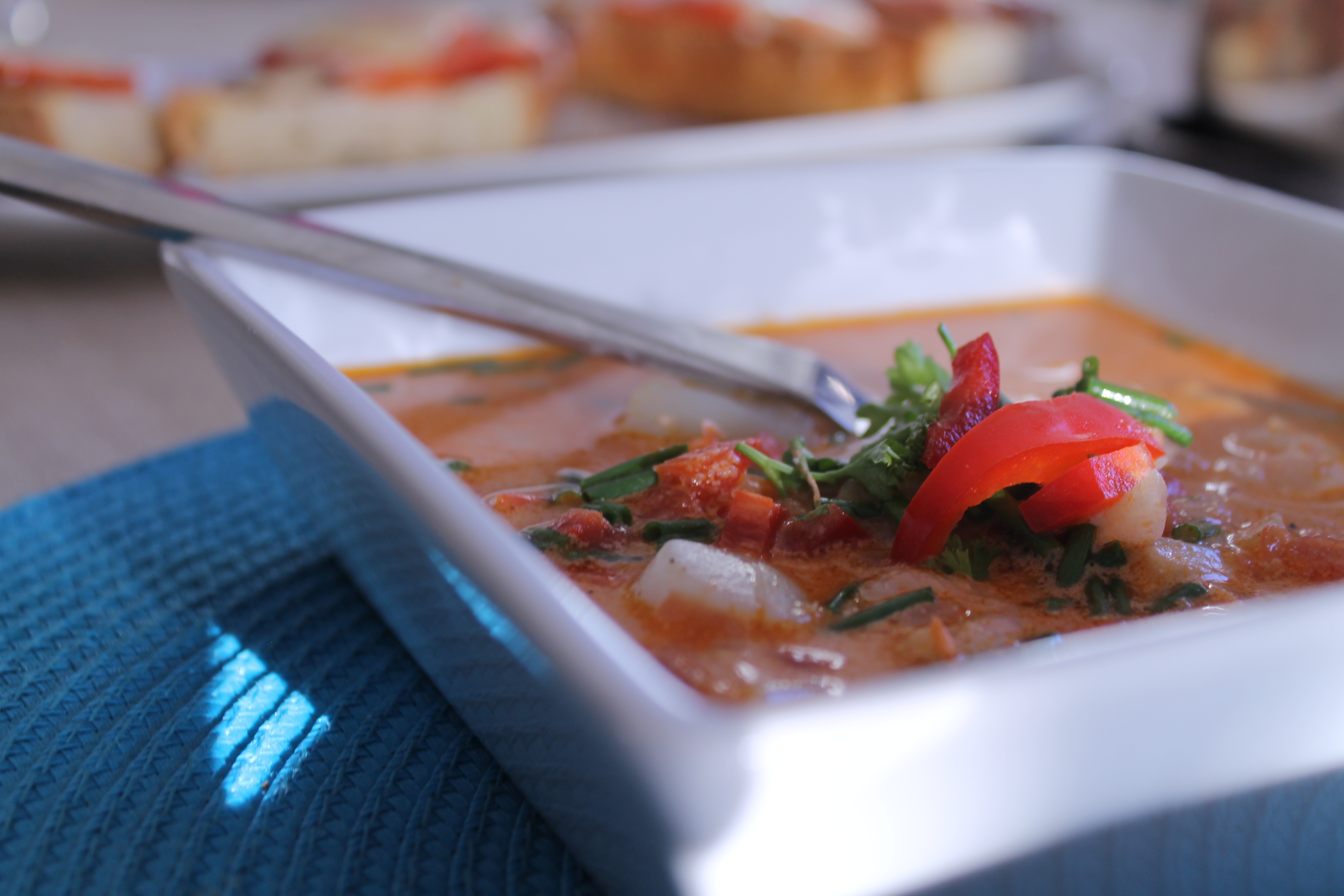 Fáar súpur toppa góða fiskisúpu. Létt en þó saðsöm og stútfull af hollustu sem börn og fullorðnir kunna vel að meta. Þetta er einföld uppskrift sem gott er að grípa í þegar tíminn er naumur – hráefnalistinn er einungis til viðmiðunar, það gerir lífið bara skemmtilegra að nýta og nota það sem til er hverju sinni og prufa sig áfram. Ég fór í kistuna og fann til sjávarfang sem beið eftir að komast í súpu og í grænmetisskúffunni okkar er nú oftast til laukur, gulrætur og paprika. Graslaukurinn í garðinum kallar á mig á hverjum degi svo fagurgrænn og bústinn sem hann er orðinn. Ég stelst líka í steinseljuna sem brýst úr moldinni en þyrfti að fá smá frið í viku eða tvær til að verða að myndarlegum brúski -vonandi lifir hún þetta áreiti af. Þessar æfingar að skrifa niður uppskriftirnar um leið og eldað er reynir svolítið á um leið og ég skemmti mér konunglega við þessar æfingar sem matarbloggið er – hvur veit hvert þetta leiðir, en á meðan þetta er skemmtilegt þá mun ég halda þessu áfram.