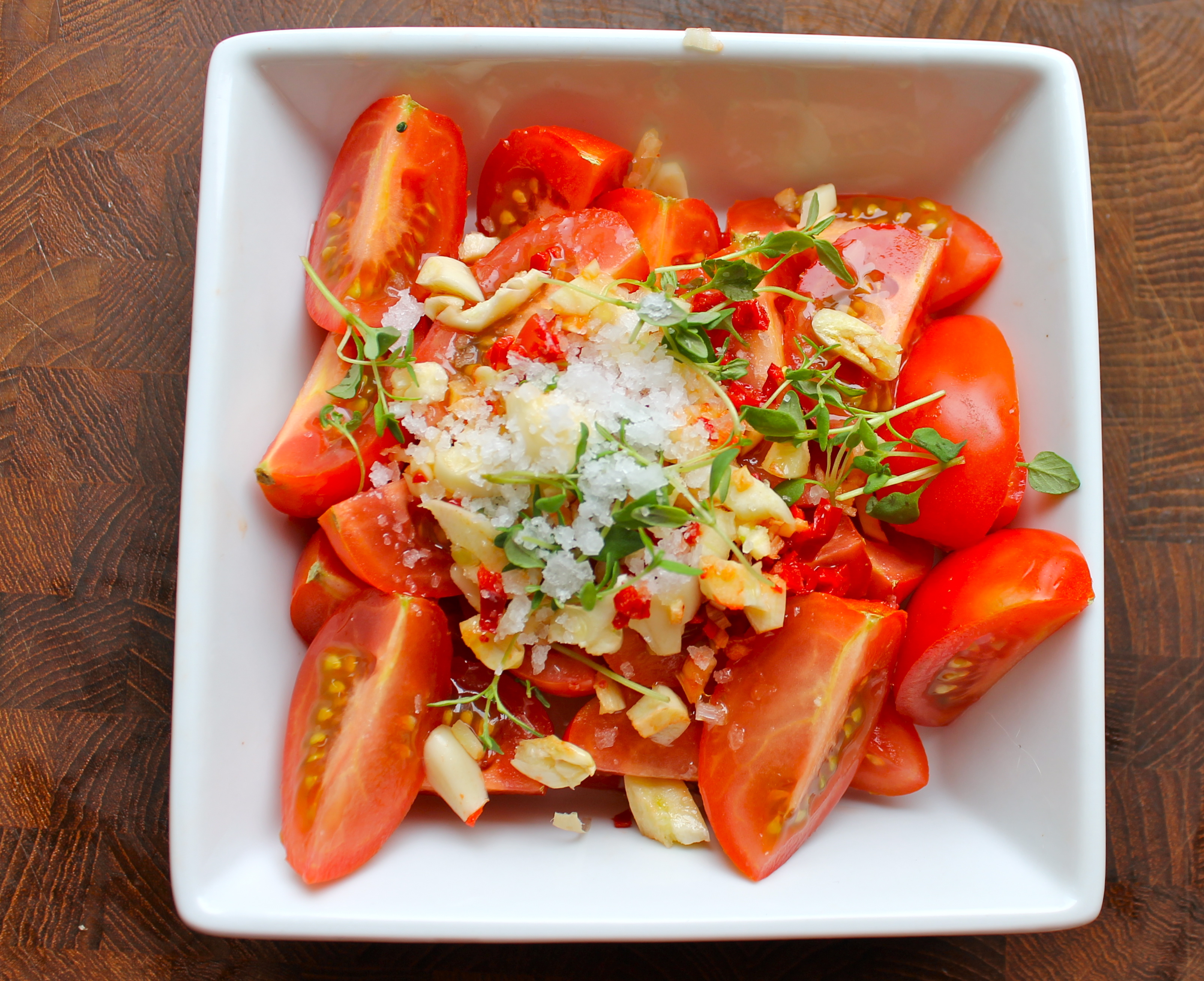 Skerið tómatana í 2 – 4 parta eftir stærð, kremjið hvítlauksgeirana með flötu hnífsblaði og skerið í grófa bita. Blandið tómötum, hvítlauk, chilli, ólífuolíu, tímían, og salti saman í eldfast mót og bakið við 220°C í 15 mínútur. Kælið í nokkrar mínútur og blandið saman við couscousið. Setjið í skál og bætið hnefafylli af klettakálið út í.