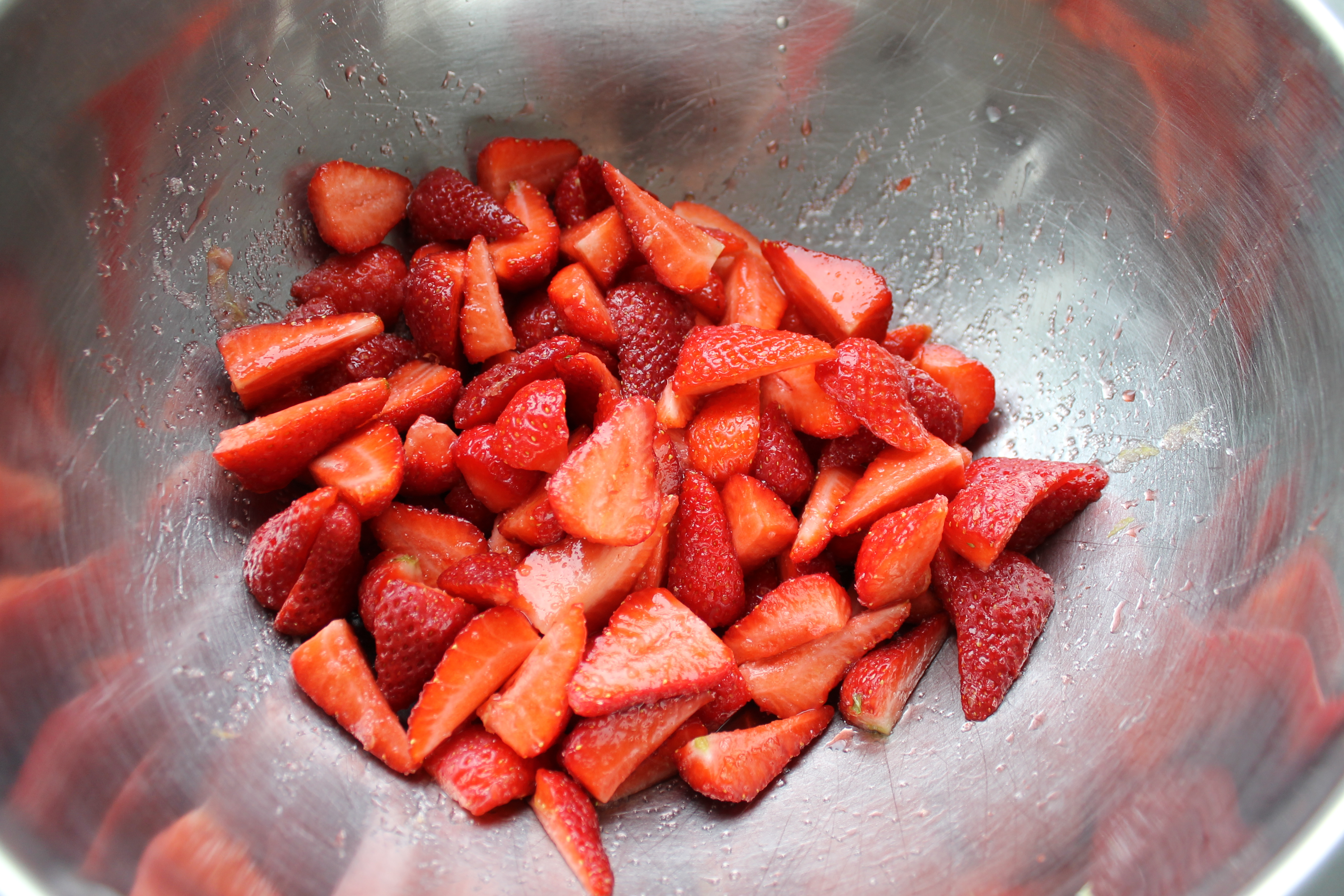 Klukkustund áður en kakan er borin fram eru jarðaberin skorin í bita, sítrónusafi, sítrónubörkur og sykur blandað saman í stóra skál og jarðaberjunum blandað saman við. Látið standa í u.þ.b. 30 mínútur.