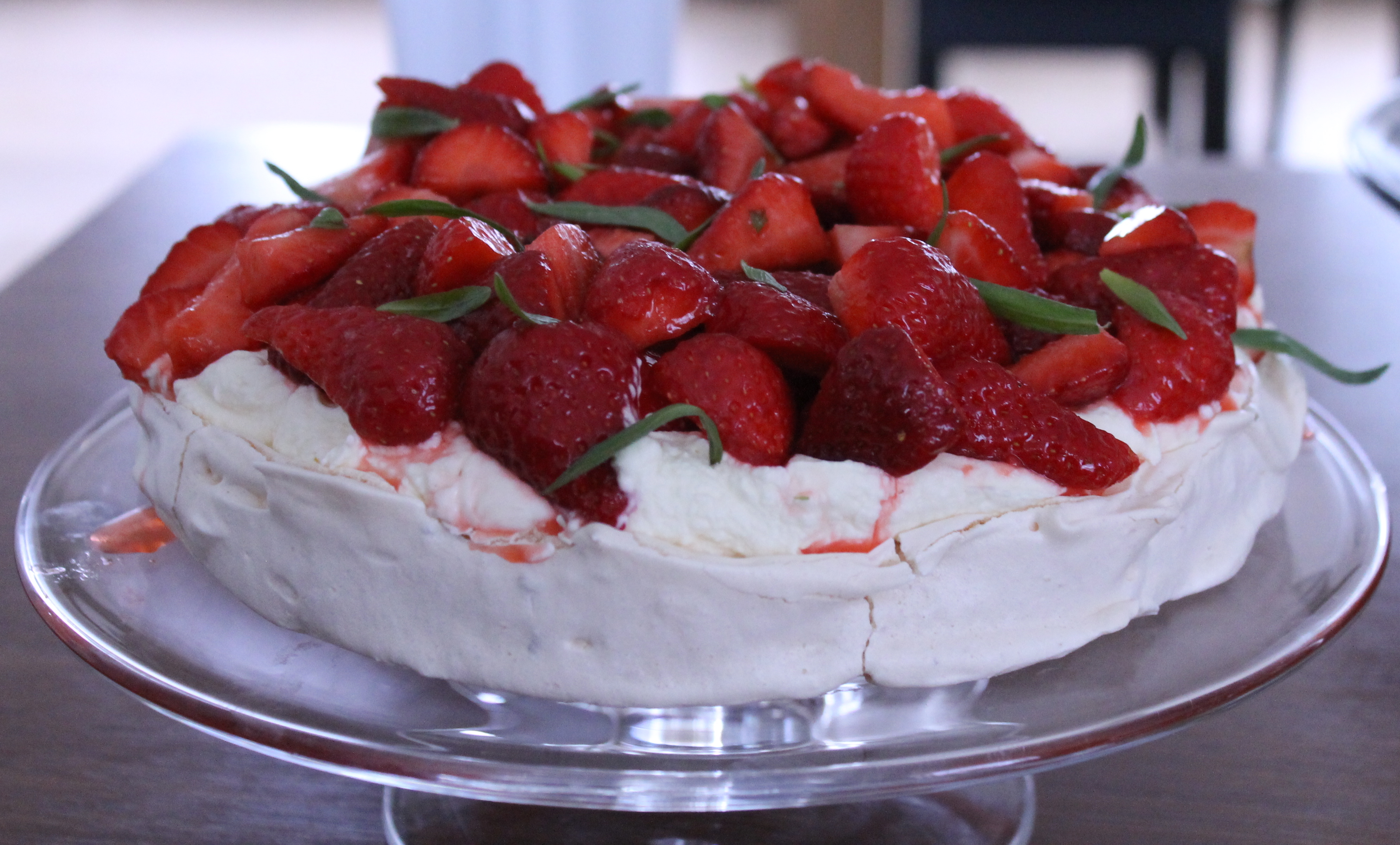 Smyrjið rjómablöndunni á pavlovubotninn, setjið jarðaberjablönduna ofan á og skreytið með ferskum esdragon laufum.