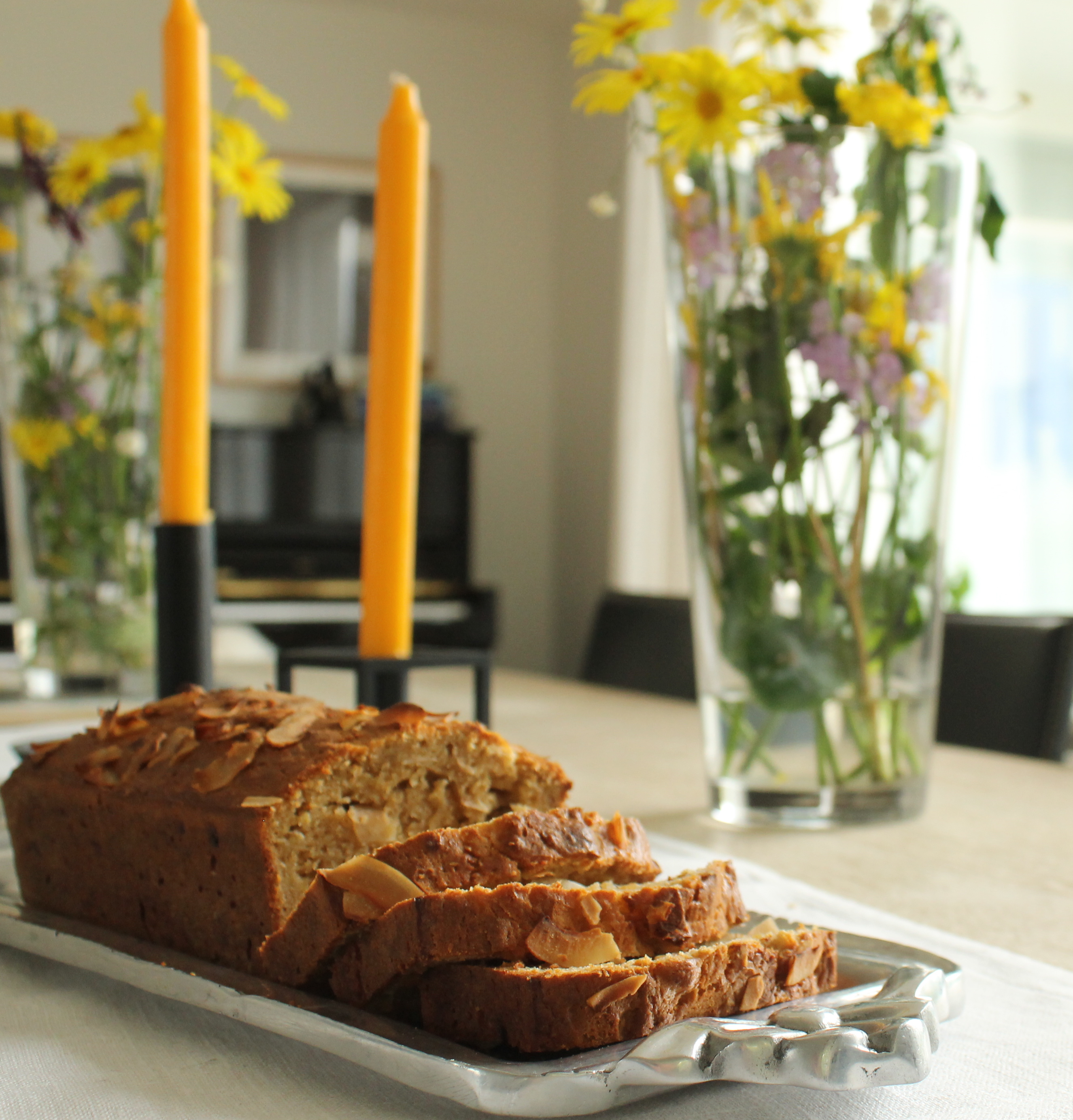 - 1/2 bolli kókosflögur ristaðar á pönnu +1/4 bolli óristaðar til að setja ofan á brauðið