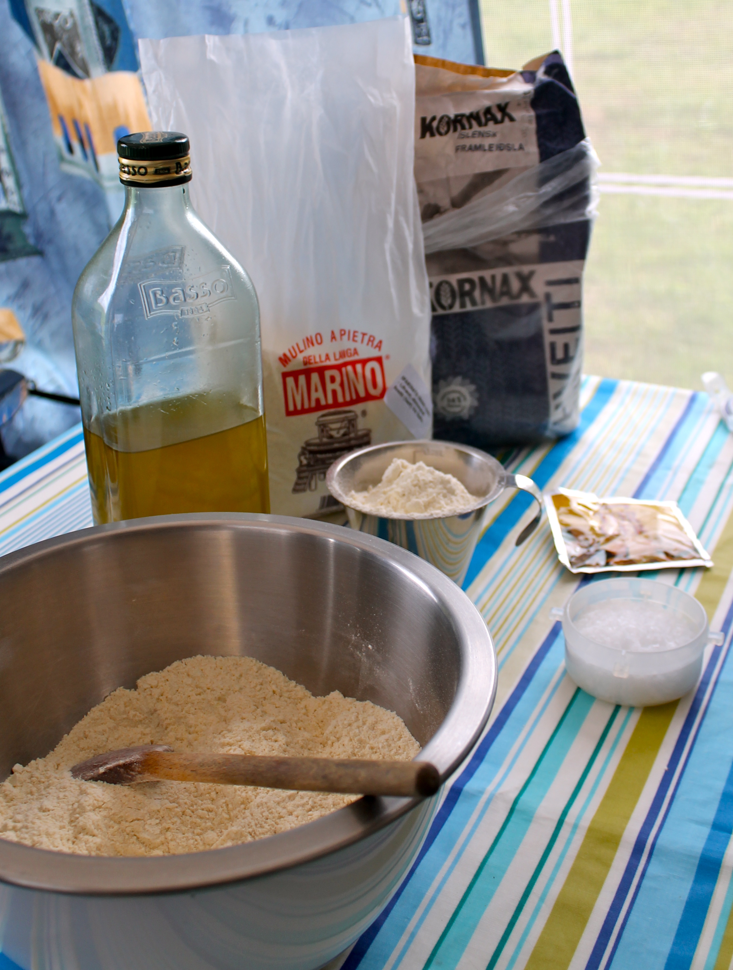 Best er að leysa gerið upp í volgu vatni með hunangi, þar til það byrjar að freyða – þetta ferli tekur um 10 – 15 mínútur. Ég hef nú ekki alltaf tíma og/eða þolinmæði í þetta fyrsta þrep og sleppi því oft …. svona til að vera alveg heiðarleg 🙂 Blandið saman hveiti, salti og olíu og hellið gerblöndunni (eða vatni, geri og hunangi) saman í skál og hnoðið vel saman eða þar til deigið hefur fengið góða áferð. Ef þið eruð að baka pizzu heima er hægt að hnoða deigið í hrærivél með hnoðunarkrók, annars bara í höndunum. Í tjaldi er um að gera að hnoða þetta mest í skálinni sjálfri. Leyfið deiginu að hefast í skál undir klút í 30 – 120 mínútur +/- þann tíma þið hafið til þess. Við skellum oft í deig og förum síðan í sund eða gönguferð og ola þegar heim eða í tjald er komið býður þetta líka dásamlega deig tilbúið til að vinna með.