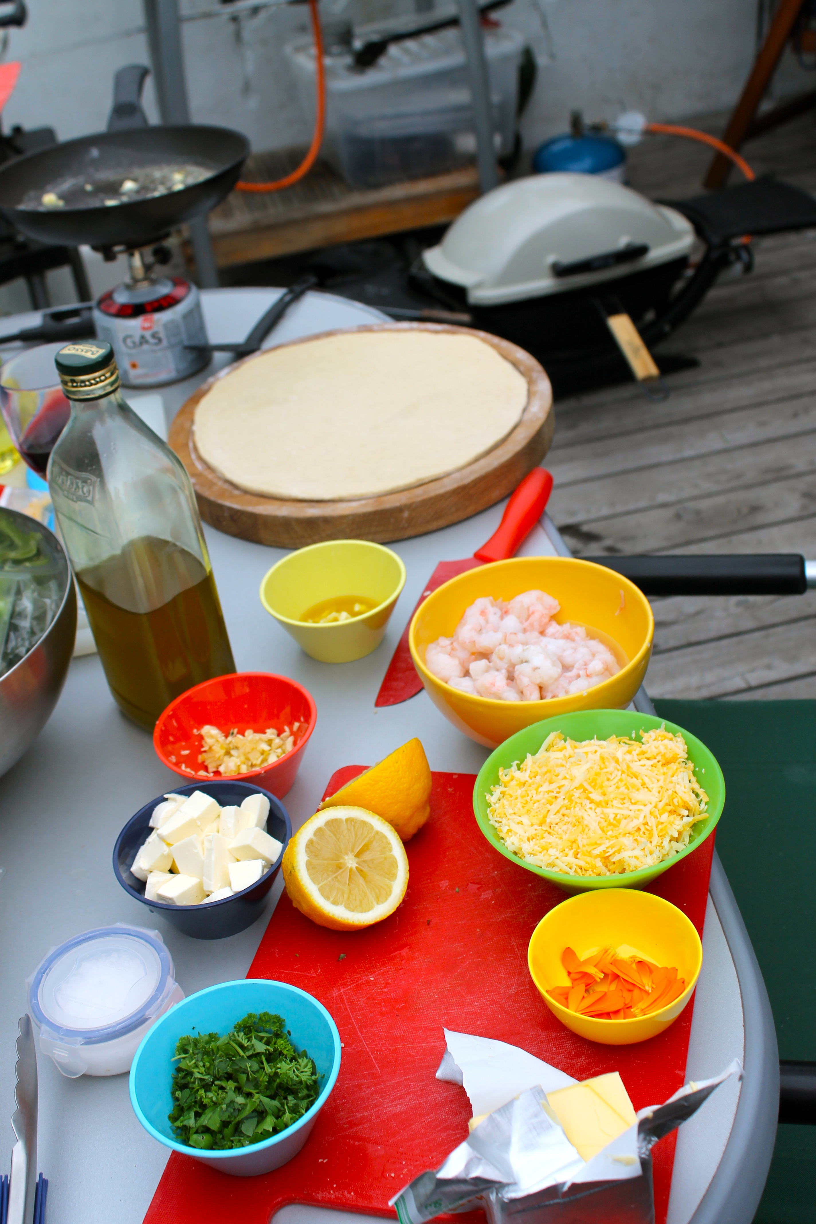 Þegar pizza er grilluð á útigrilli eins og hér er gert – er botninum skellt á grill-pizzapönnu áður en áleggið er sett á botninn, pannan sett á funheitt grillið og grillinu lokað í nokkrar mínútur. Þá er botinum snúið við á pönnunni og nú er tímabært að raða álegginu á.