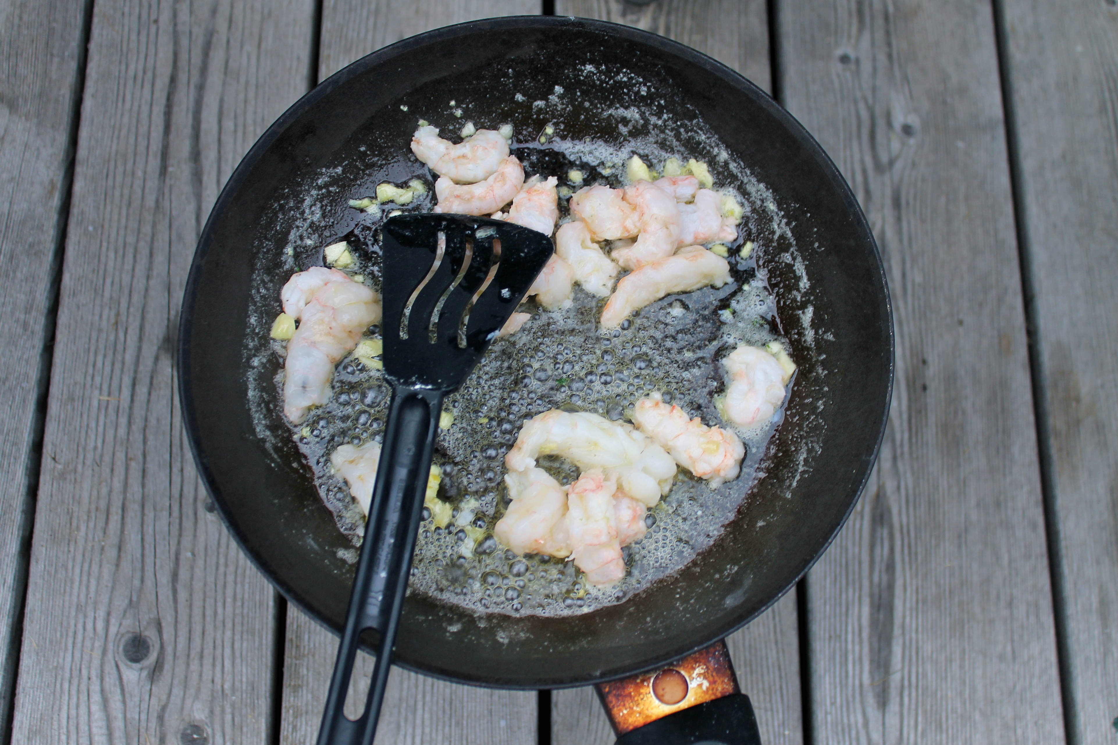 Á meðan pizzabotninn er að grillast er smjör með svolítilli olífuolíu brætt á pönnu, 2 velsaxaðir og marðir hvítlauksgeirar settir út í brætt smjörið og leyft aðeina að hitna, þá er 1/3 af humrinum bætt á pönnna og steikt í smá stund – gætið þess að ofsteikja humarinn ekki -betra er að hafa hann aðeins of lítið steiktan. Kreistið u.þ.b. 1 msk. safa úr sítrónu út á pönnuna og saltið og piprið. Raðið humrinum á pizzabotninn sem nú er nánast tilbúinn, hellið hæfilegu magni af sítrónu-smjörblöndunni af pönnunni yfir pizzuna og lokið grillinu í eina mínútu eða svo. Stráið saxaðri steinselju og blöðum af morgunfrú yfir pizzuna og berið fram.