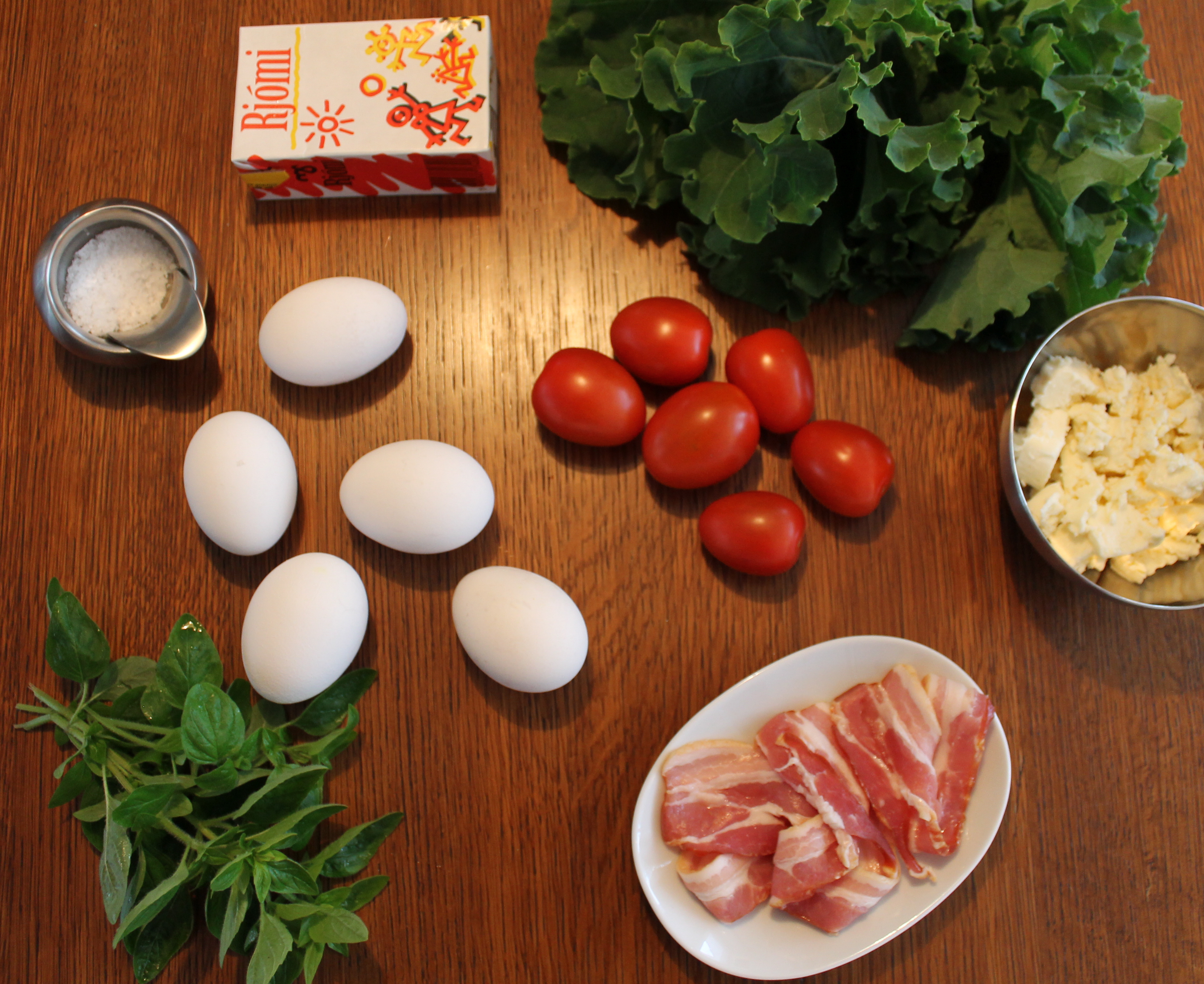 Setjið beikonið yfir grænkálið, raðið tómötum og fetaosti yfir.