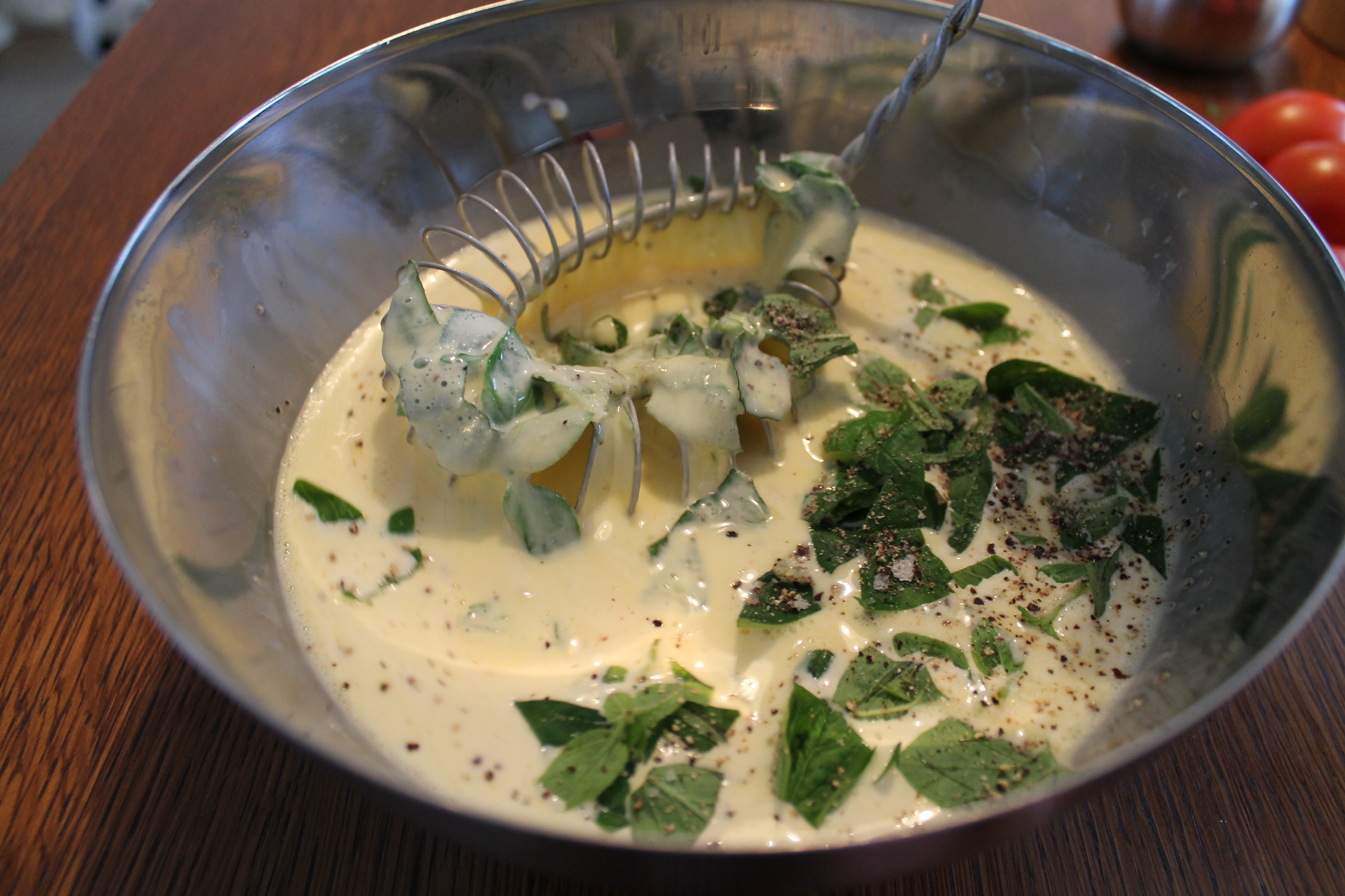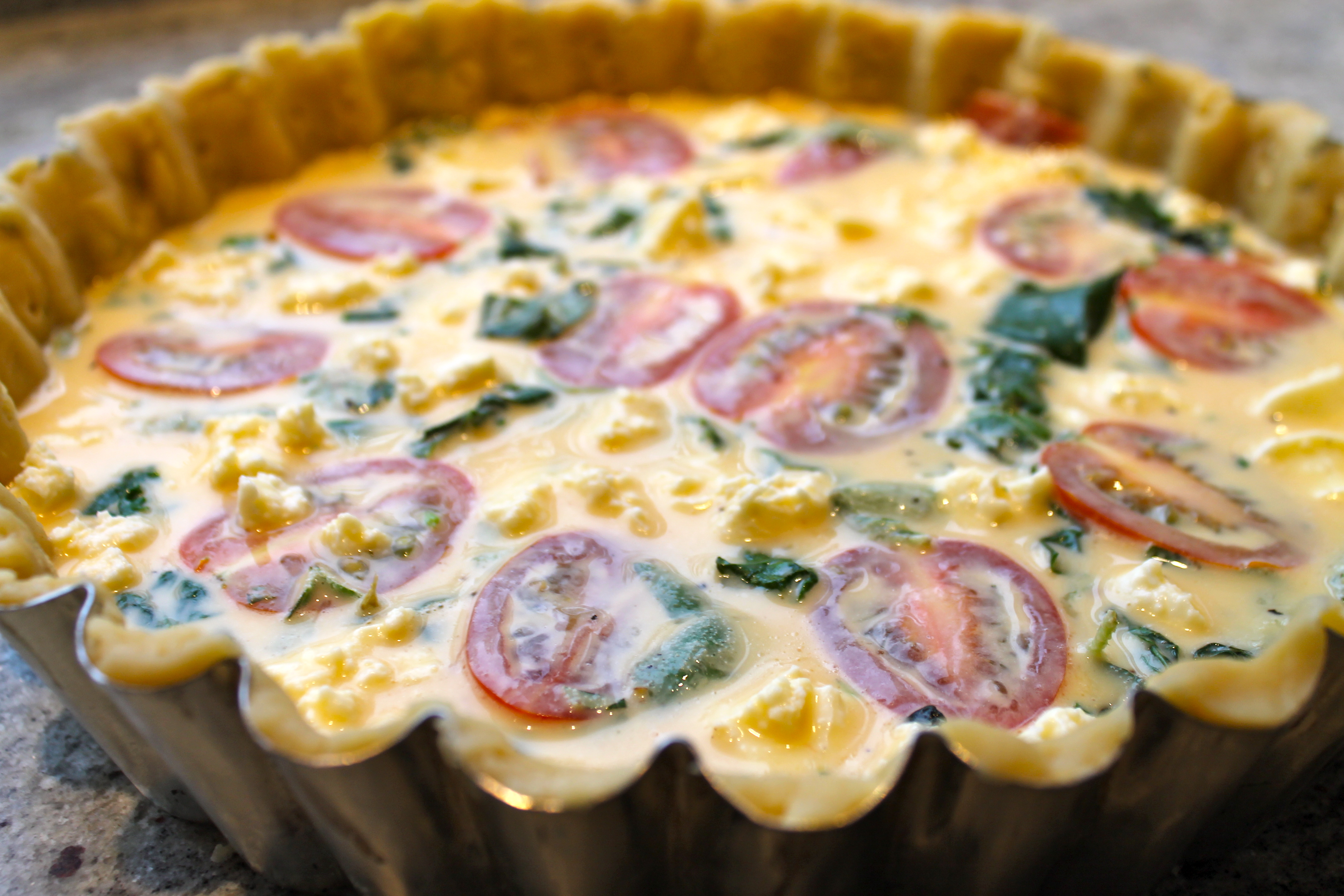 Blandið saman í skál eggjum og rjóma og þeytið með gaffli eða handþeytara. Kryddið blönduna með hvítlauk, óreganó, salti og pipar. Athugið að bæði beikonið og fetaosturinn eru fremur sölt svo farið varlega með saltið. Hellið eggjablöndunni yfir fyllinguna.
