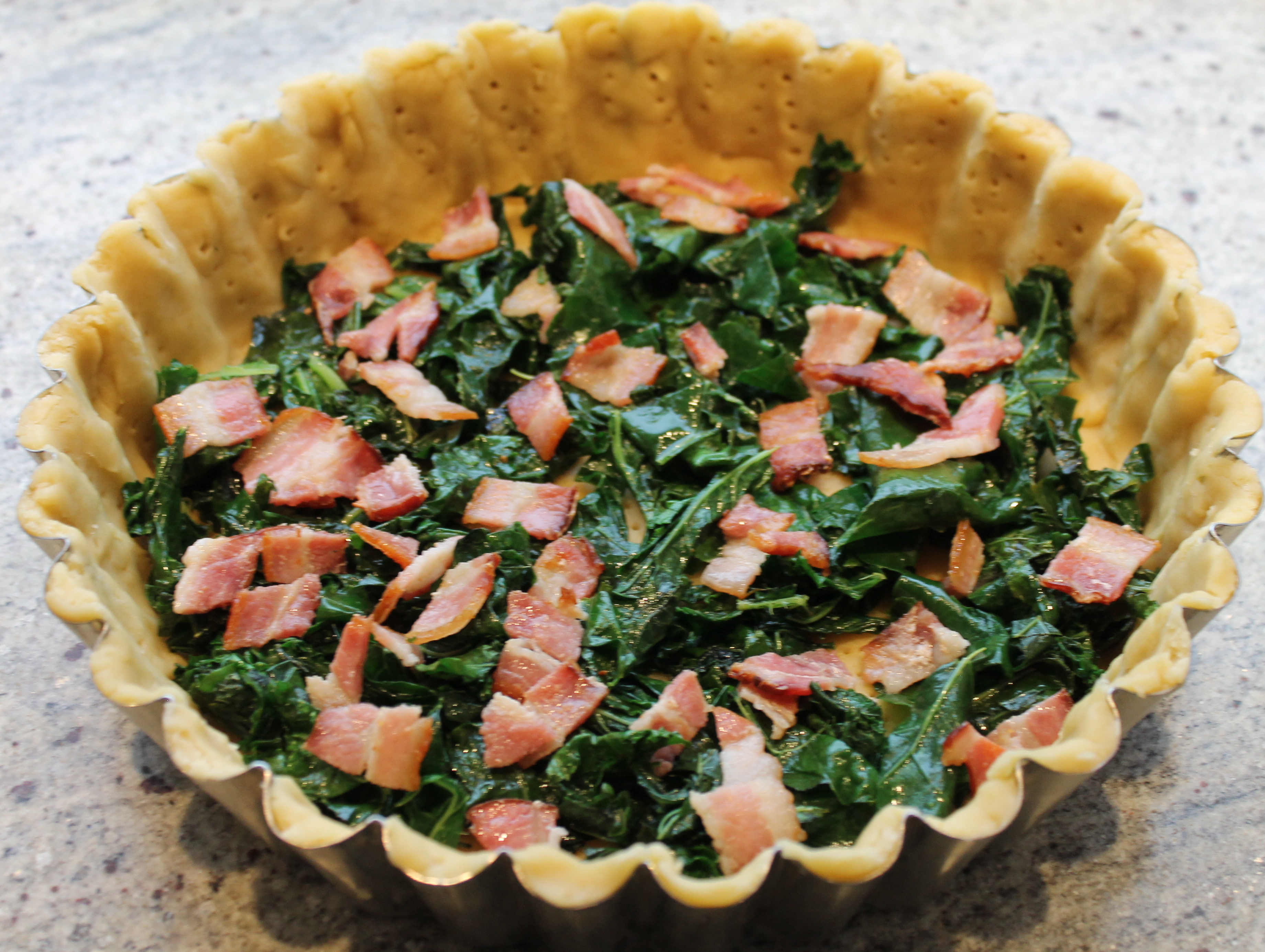 Steikið beikonið á pönnu, kælið og skerið í bita. Steikið grænkálið upp úr feitinni af beikoninu og setjið á bökubotninn.