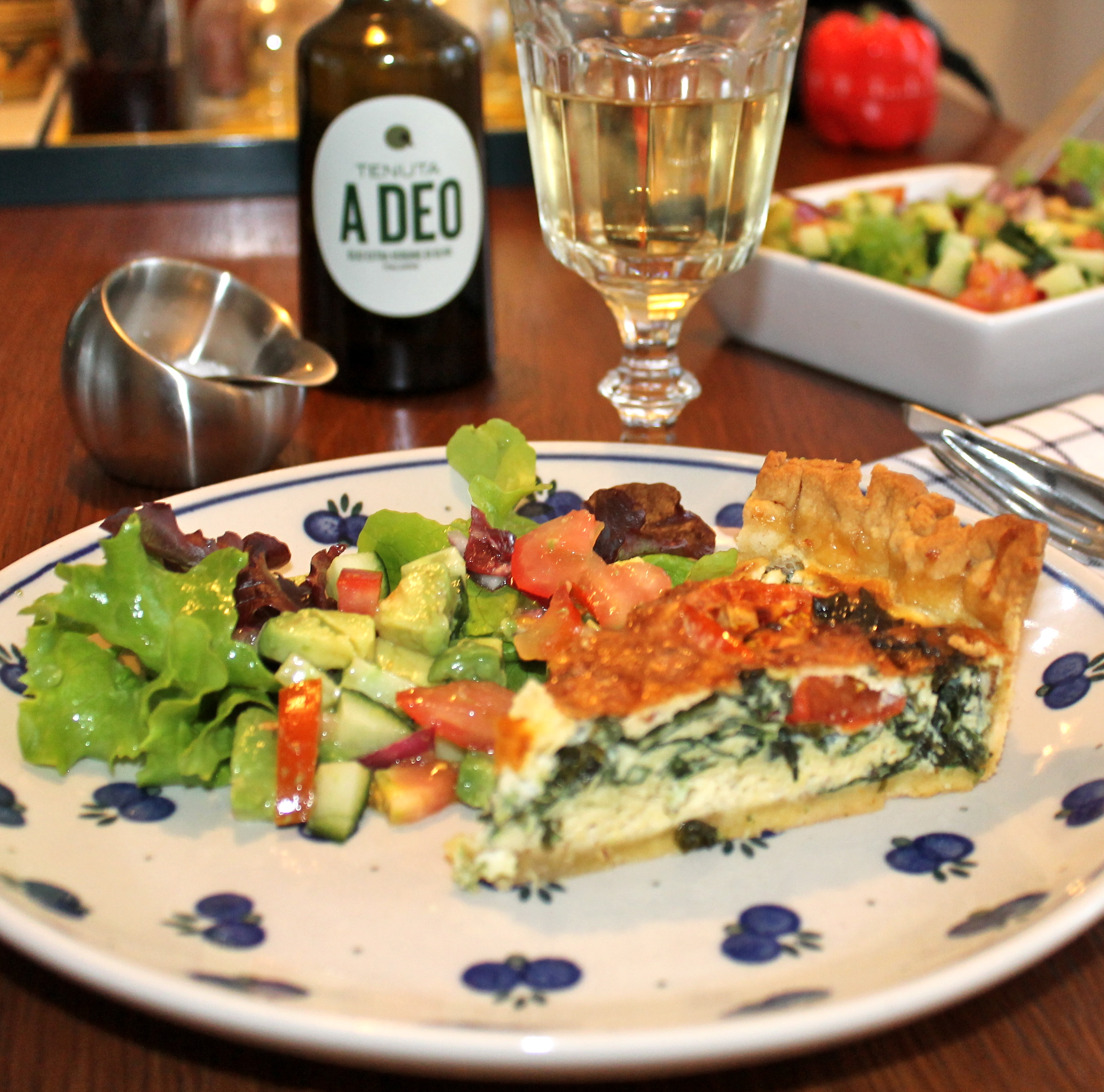 Fetaostur, konfekttómatar og ferskt oreganó leika líka stórt hlutverk í þessari böku – en auk salatsins ræktum við mikið af kryddjurtum í garðinum okkar. Það er fátt sem jafnast á við það að trítla út í garð og ná í ferskar kryddjurtir, salat svo ekki sé minnst á smælki þegar líður á sumarið – já sumarið er svo sannarlega tíminn, vott eða þurrt 🙂 Góðar grænmetisbökur standa alltaf fyrir sínu, bæði sem léttur kvöldverður en ekki síður í árdegisverðarboðinu eða góðum veislum stórum og smáum.