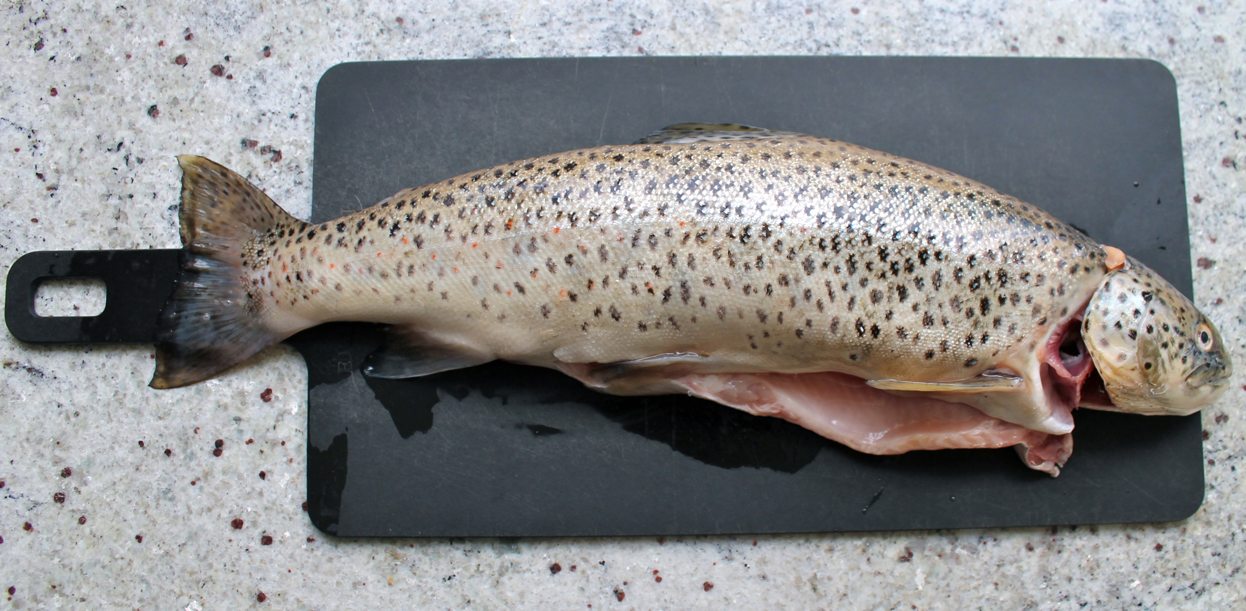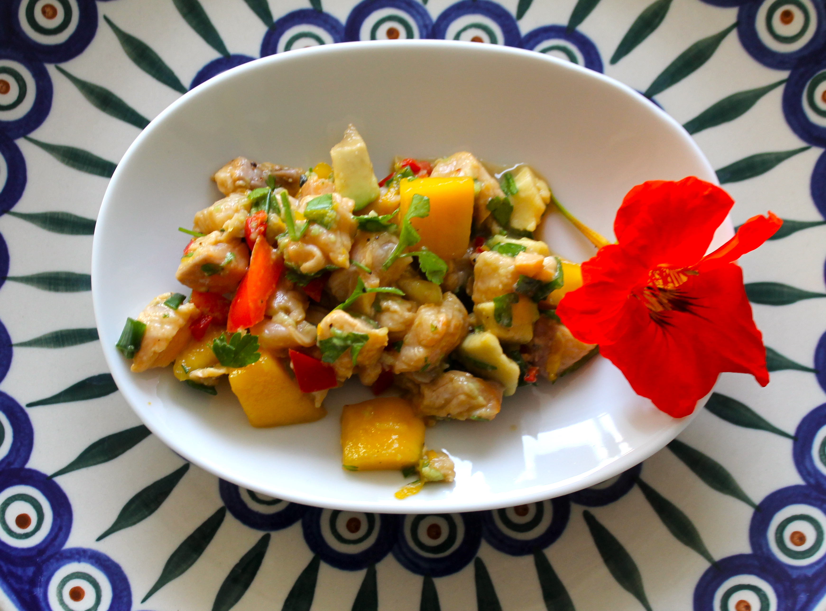 Það er fátt betra en nýr silungur og eftir smá umhugsun og könnun á birgðarstöðunni í ísskápnum ákváðum við að útbúa einfaldan og ferskan forrétt sem unnt er að útfæra á ótal mismunandi vegu. Grunnurinn er að sjálfsögðu nýr og ferskur silungur, safi úr sítrus ávexti og ferskt kóríander Annað er spilað af fingrum fram og fer eftir því í hvaða stuði maður er og því hvað til er í ísskápnum og kryddjurtabeðinu fyrir utan stofugluggann. Skjaldfléttuna rækta ég sérstakleg til að skreyta hina ýmsu rétti, það er svo gaman að lyfta einföldu sallati eða öðrum réttum aðeins upp með ætum blómum s.s. fjólu, morgunfrú eða skjaldfléttu.
