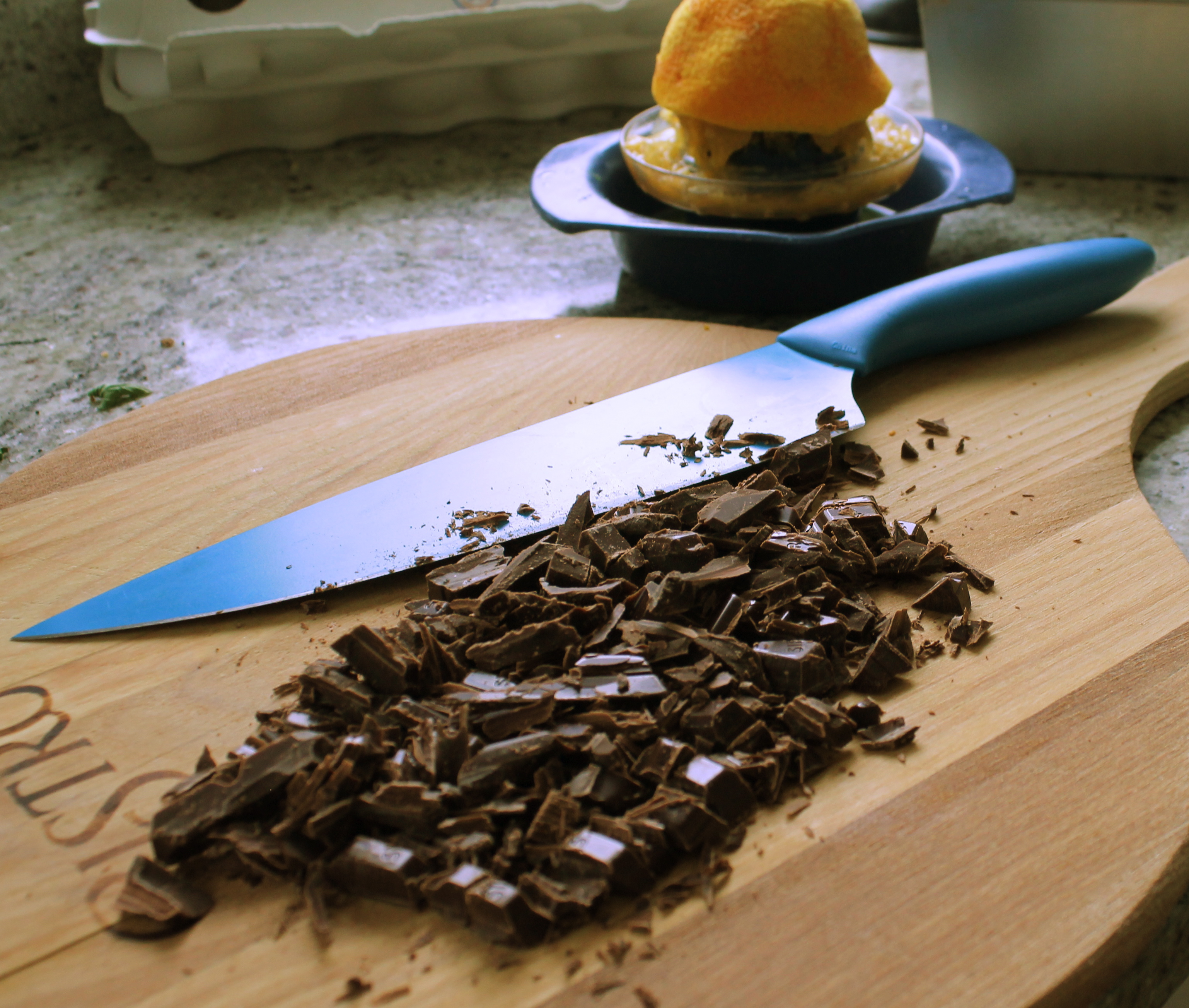 Hrærið smjör og sykur vel saman. Bætið eggjunum saman við einu í senn og hrærið vel. Blandið hveiti og lyftidufti saman og bætið út í og hrærið þar til allt hefur blandast vel þá er appelsínusafa og berki bætt út og loks súkkulaði. Sett í velsmurt og hveitistráð formkökuform.