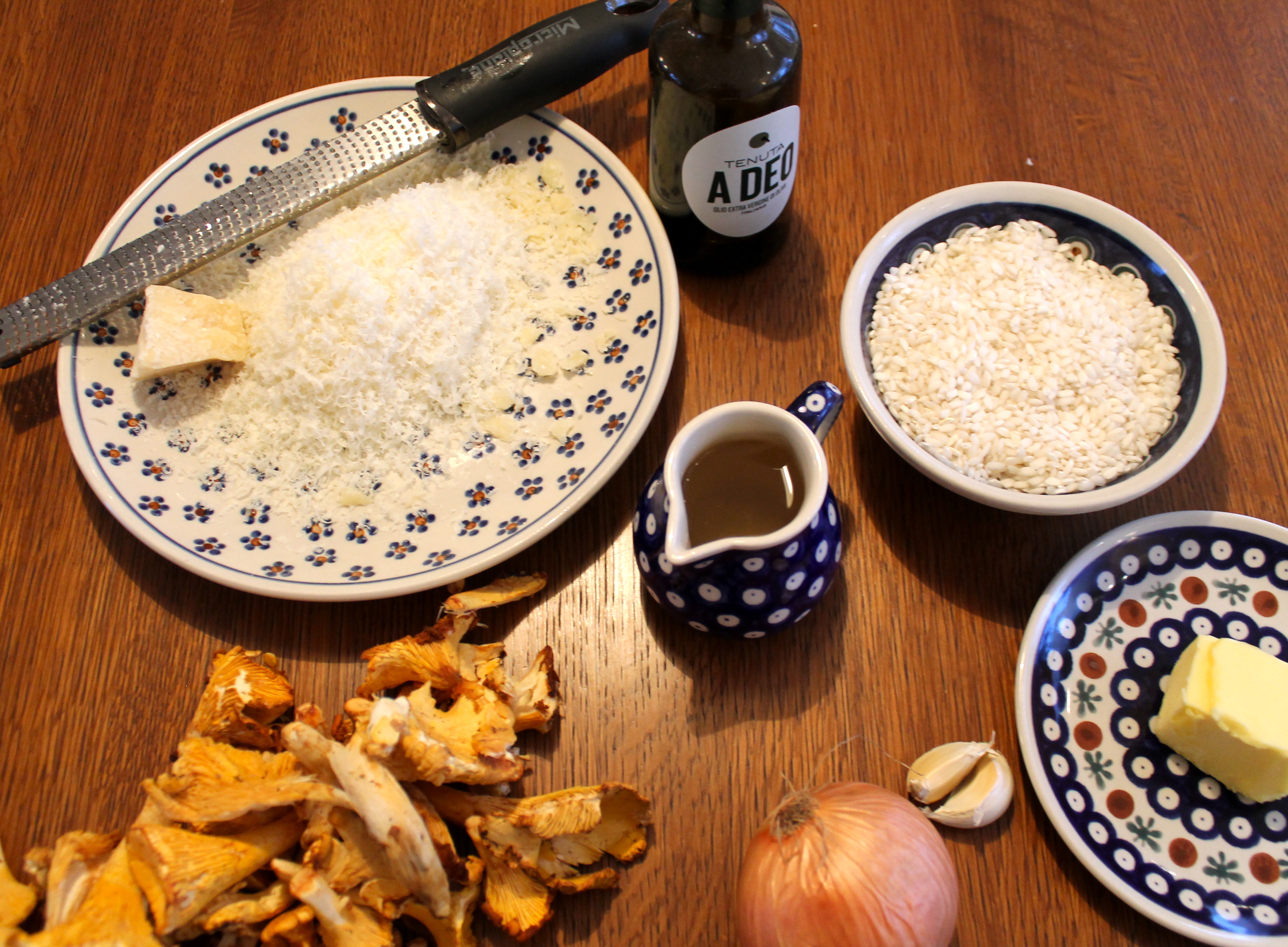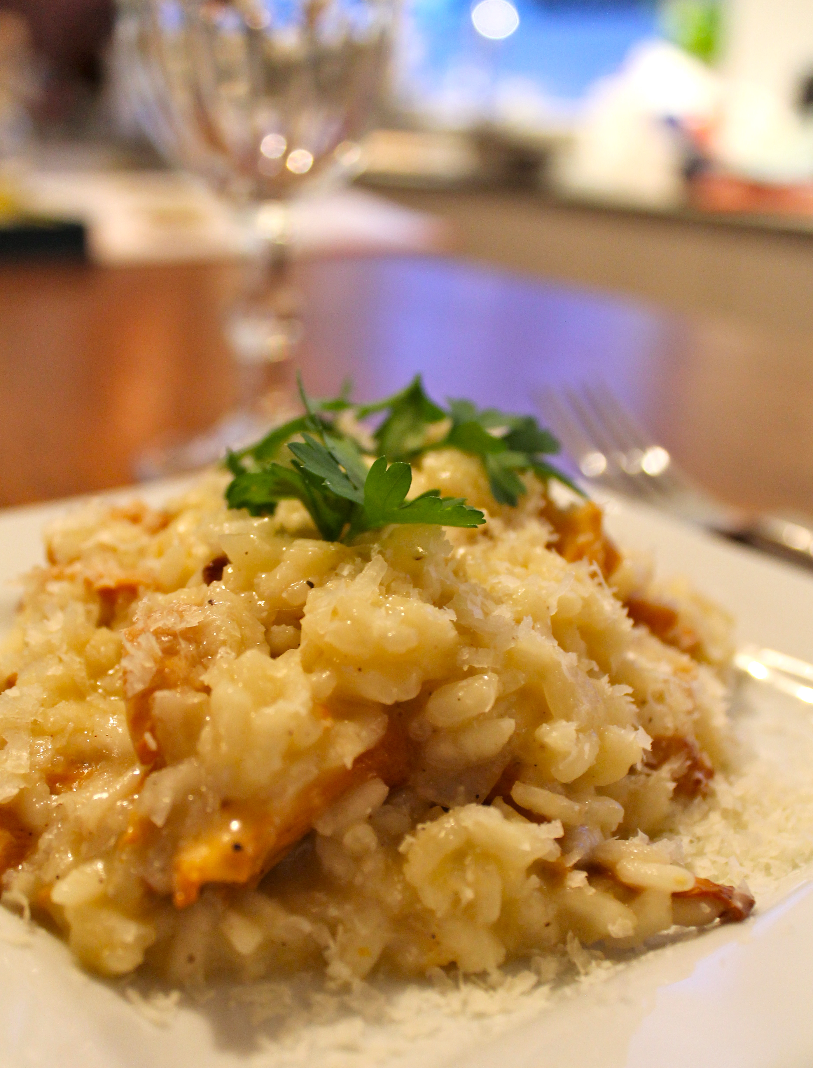 Setjið hrísgrjónin út á pönnuna og hrærið vel saman, leyfið grjónunum að hitna vel í gegn, þau verða nánast glær í endana. Hellið þá hvítvíninu út á pönnuna og sjóðið það upp í grjónin. Hellið einni ausu af góðu soðinu út á grjónin í einu og hrærið vel. Grjónin eiga nánast að kalla á meira soð á milli þess sem þið ausið soðinu yfir grjónin. Þegar grjónin eru nánast soðin – það er svolitið bit er í þeim, bætið kantarellunum út í. Þá er smjörinu hrært saman við og loks nánast öllum parmesan ostinum. Kryddið með salti og pipar eftir smekk og berið réttinn fram velheitan með örlitlu af rifnum parmesan osti og ferskri steinselju.