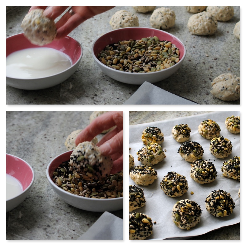 Blandið helmingnum að fræjunum sem ekki fóru í deigið saman og setjið í grunna skál. Til þess að fræin festist og haldist vel á bollunum finnst mér best að dýfa bollunum fyrst í mjólk sem ég set í grunna skál og síðan í fræblönduna.