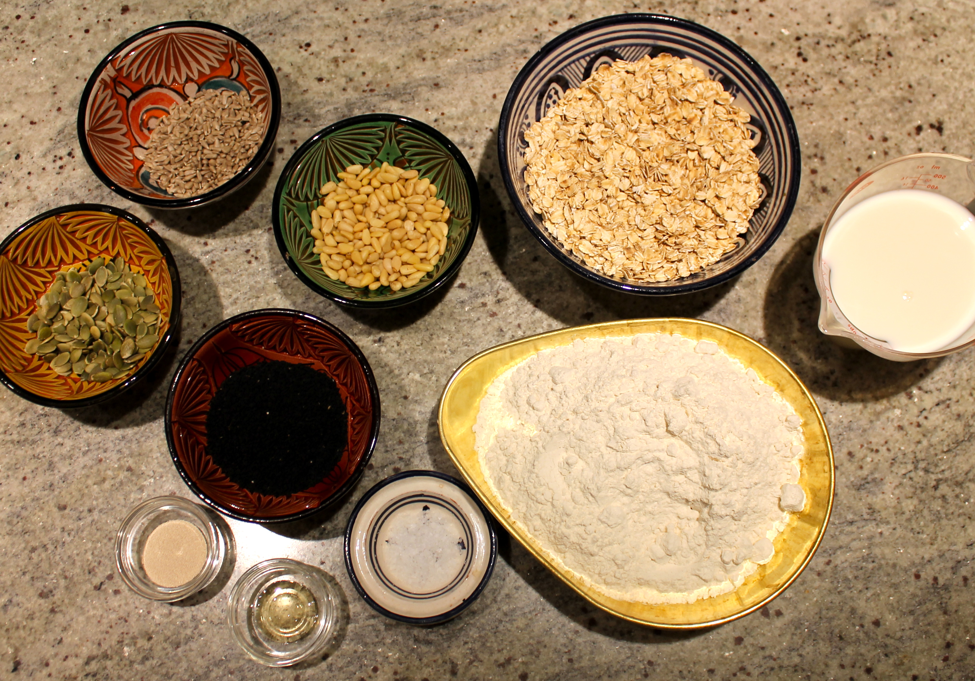 Þessar bollur eru ákaflega góðar og skemmtilega ólíkar hefðbundnum brauðbollum, það gera furuhnetur, hafrar og góð blanda af fræjum. Verið óhrædd við að breyta fræjum og hnetum og skipta út eftir hentugleika. Í þetta sinn notaði ég svört sesamfræ sem ég keypti á markaði í Íran í vor og finnst mjög gaman að nota í brauð, venjulega nota ég bara þessi hefðbundnu ljósu. Ef furhnetur er ekki tiltækar þá er alveg í lagi að setja annarskonar hnetur t.d. valhnetur.