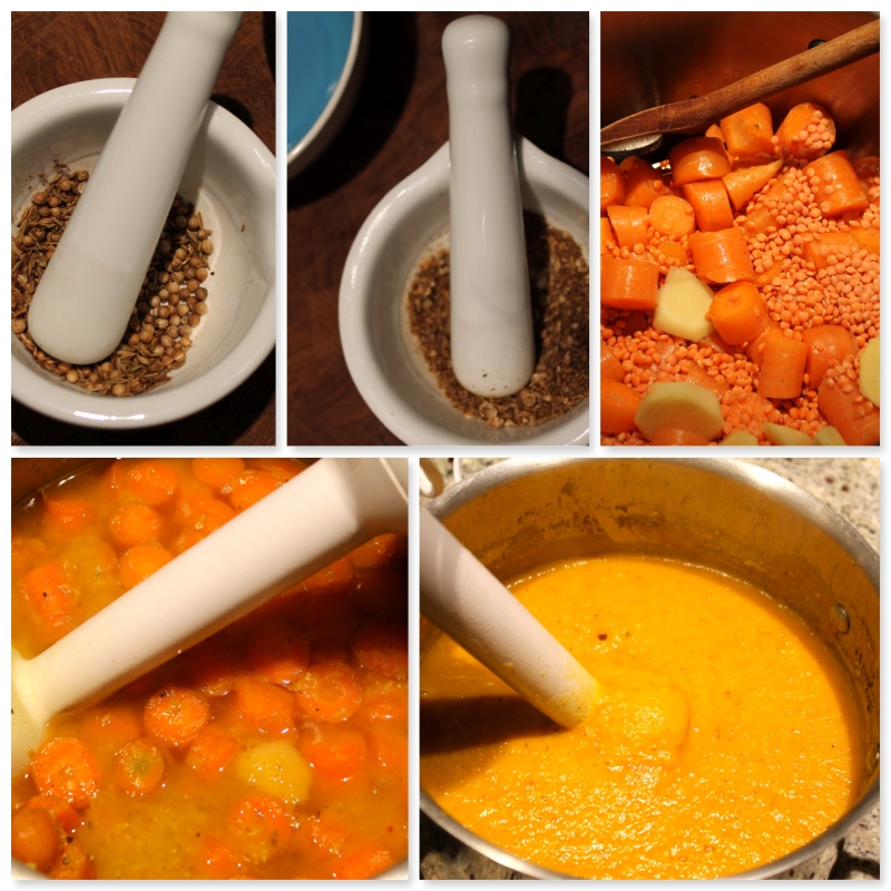 Ristið cumin fræin á þurri pönnu eða bara í pottinum sem þið hyggist nota fyrir súpuna. Takið helminginn og setjið í mortél en geymið helminginn til að strá yfir súpuna þegar þið berið hana fram. Ristið kóríander fræin og setjið í mortélið með cumin fræjunum og steytið.