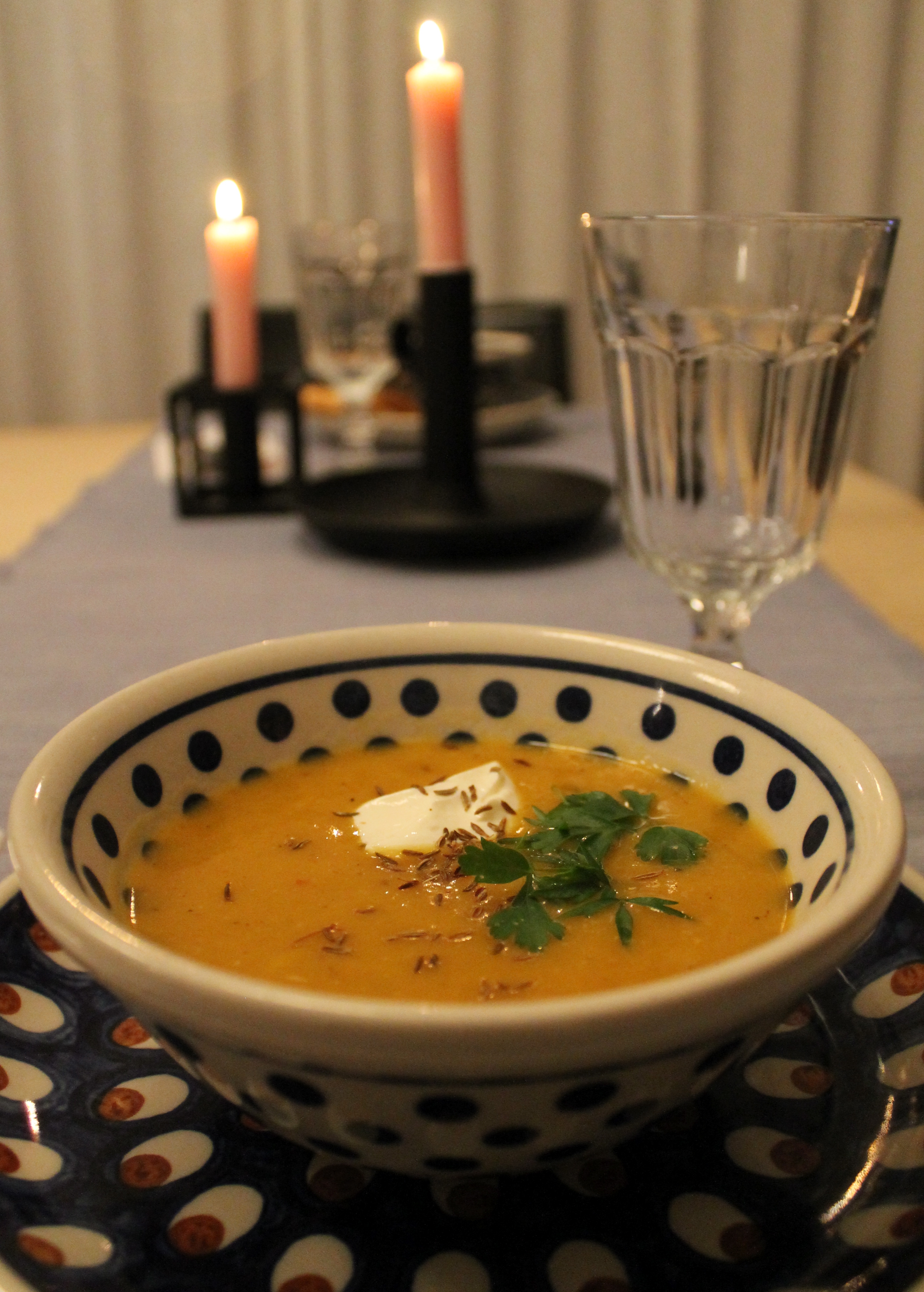 Á haustin finnst mér svo gott að útbúa heitar og góðar súpur úr öllu því dásamlega íslenska grænmeti sem stendur okkur til boða í verslunum og/eða við ræktum sjálf. Raunar er haustið búið og veturinn kominn, en íslensku gulræturnar eru ennþá til svo dásamlega safaríkar og sætar -upplagðar í góða súpu, velkryddaða með rauðum linsum. Þetta er líka góð aðferð til að fá börn og unglinga til að borða meira af þessu holla og góða hráefni, en gætið þess að minnka kryddið, sérílagi chili og engifer ef til stendur að elda þessa súpu fyrir börn, þau eru yfirleitt ekki hrifin af of sterkum mat. Ég vil hins vegar láta súpuna rífa aðeins í og er smátt og smátt að koma unglingnum á bragðið.
