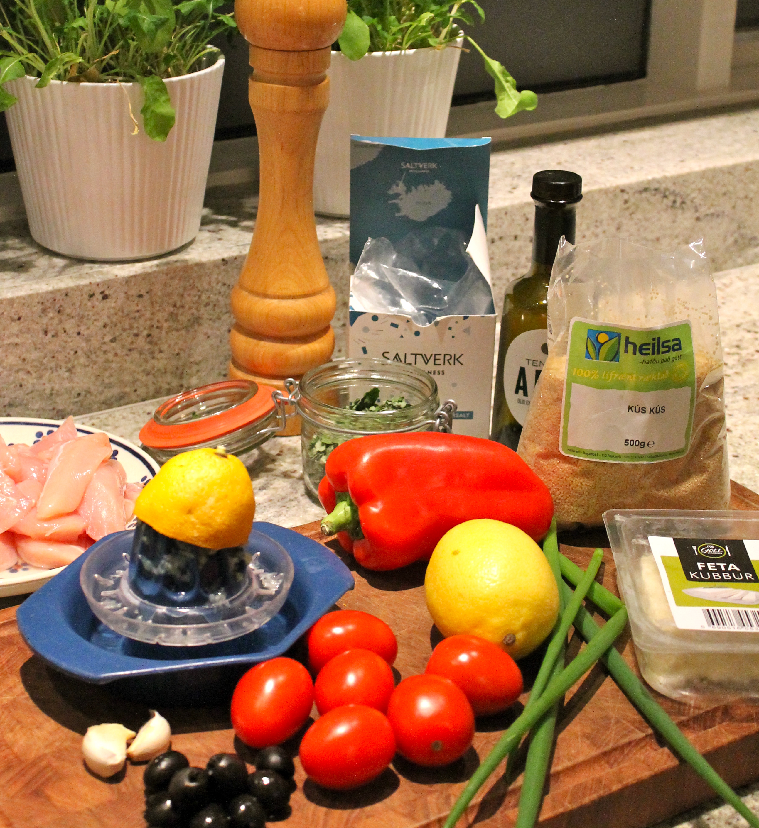 - 500 gr. beinlaus kjúklingur (við notuðum lundir, en það má líka nota bringur)