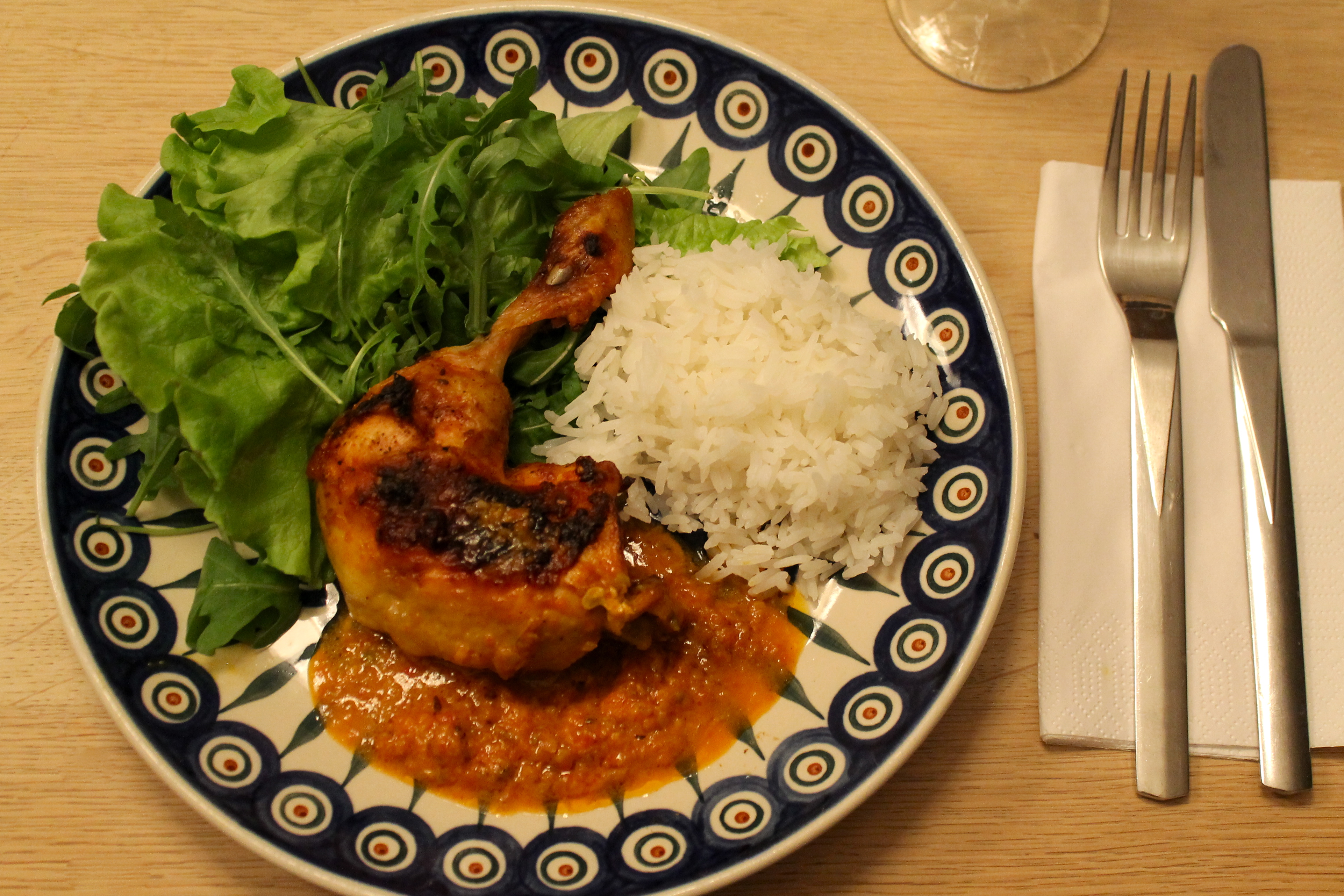 Það er án efa aðeins meiri fyrirhöfn fólgin í því að gera karrý frá grunni en að kaupa það tilbúið í krukku, en þeir sem til þekkja vita hve miklu betra slíkt karrý er. Sunnudagskvöld og annasamri og ánægjulegri helgi lokað með þessum góða rétti sem öll fjölskyldan var sammála um að væri einn sá besti. Meira að segja unglingurinn var á þeirri skoðun að þetta væri langbesti kjúklingaréttur sem hún hefði smakkað. Hugmyndin er fengin úr nýlegri bók Hugh Farnley – River Cottage – Every Day – en að sjálfsögðu breytt og aðlöguð að því sem til var í kryddskúffunni minni. Ég á von á að þessi réttur verði fljótlega aftur á borðum hér í Vatnholtinu – svo góður er hann.