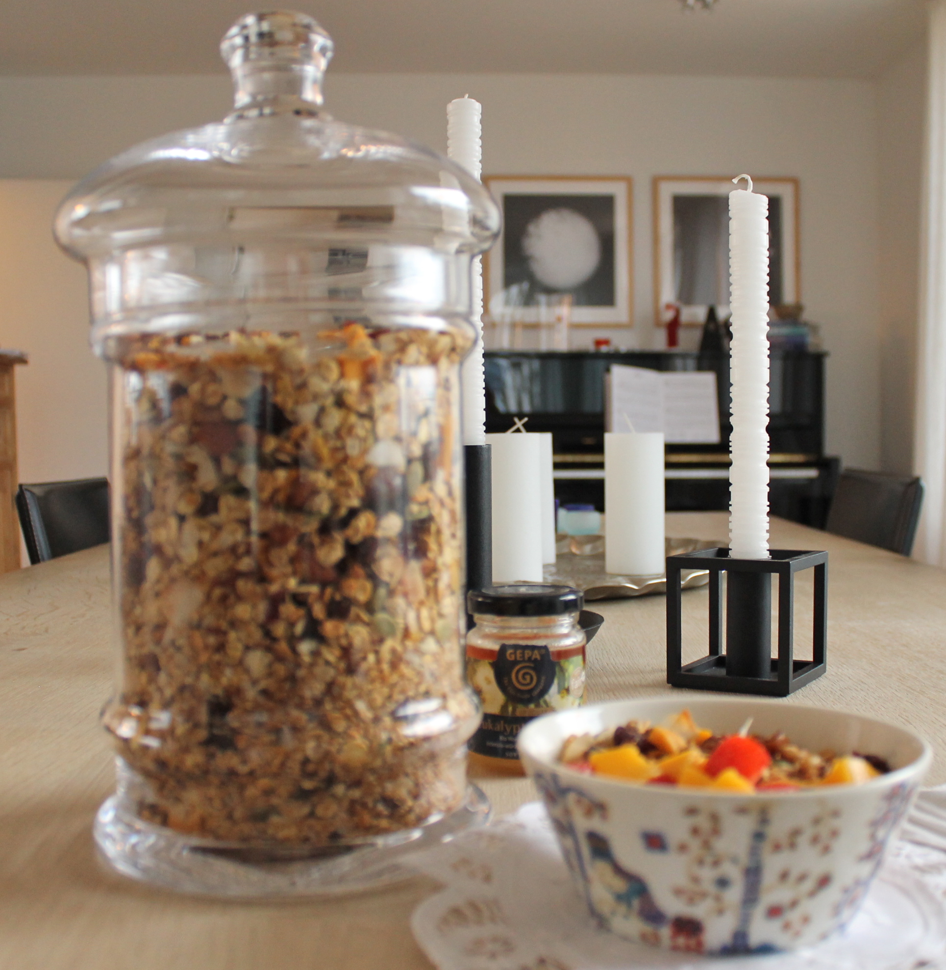 Í upphafi aðventu er mikilvægt að huga að hollustu. Það má segja að fjölskylda mín sé orðin svolítið háð því að til sé gott, já verulega gott múslí. Þegar við tölum um gott múslí þá meinum við heimagert músli. Eftir að ég uppgötvaði hve einfalt og í raun skemmtilegt er að útbúa sitt eigið múslí höfum við ekki keypt tilbúið músli og nánast ekkert annað morgunkorn. Unglingurinn var svo sem ekkert ýkja sátt við móður sína þegar múslí-blætið hófst, en svei mér ef hún er ekki smátt og smátt að sættast við þetta líkt og heimagerðu pizzurnar. Snilldin við múslígerðina er hve einföld hún er, hve auðvelt er að huga að fjölbreytni, hve gaman er að prufa sig áfram með hinar ýmsu tegundir af korni, hnetum, fræjum og þurrkuðu ávöxtum og tryggja þannig fjölbreytni og hollustu. Svei mér ef það er ekki smá sólskin í þessu músli – ekki veitir af nú þegar styðstu dagar ársins eru gengnir í garð. Kertaljós, ab mjólk, músli, hunang og ferskt mangó og jarðaber í morgunsárið – þvílík byrjun á degi 🙂