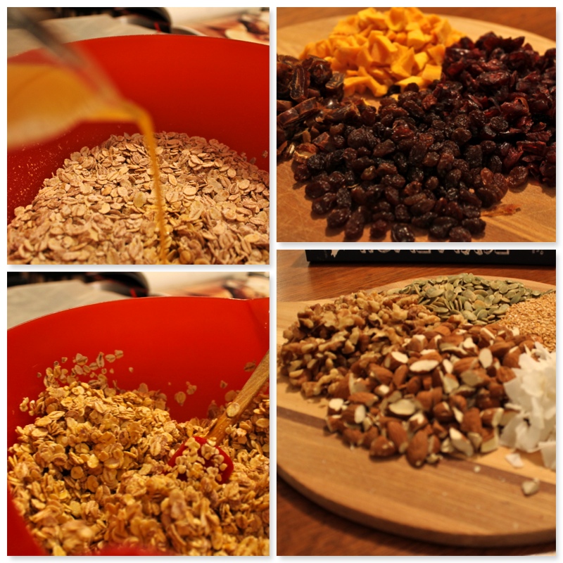 Leysið hunangið upp í mangó-eplasafanum og hrærið blöndunni út í byggflögurnar. Setjið smjörpappír á bökunarplötu og hellið blöndunni á pappírsklædda plötuna og dreifið vel. Bakið við 150°C í 15 mín og hrærið reglulega í blöndunni eða á 5 mínúntna fresti. Skerið möndlur og hnetur gróft. Blandið saman kókos, fræjum, hnetum og möndlum í skál, takið byggflögurnar úr ofninum og blandið fræ- og hnetublöndunni vel saman við. Bakið í 10 – 15 mínútur til viðbótar og hrærið í blöndunni á 5 mínútna fresti svo allt bakist jafnt og hnetur og kókos brenni síður.