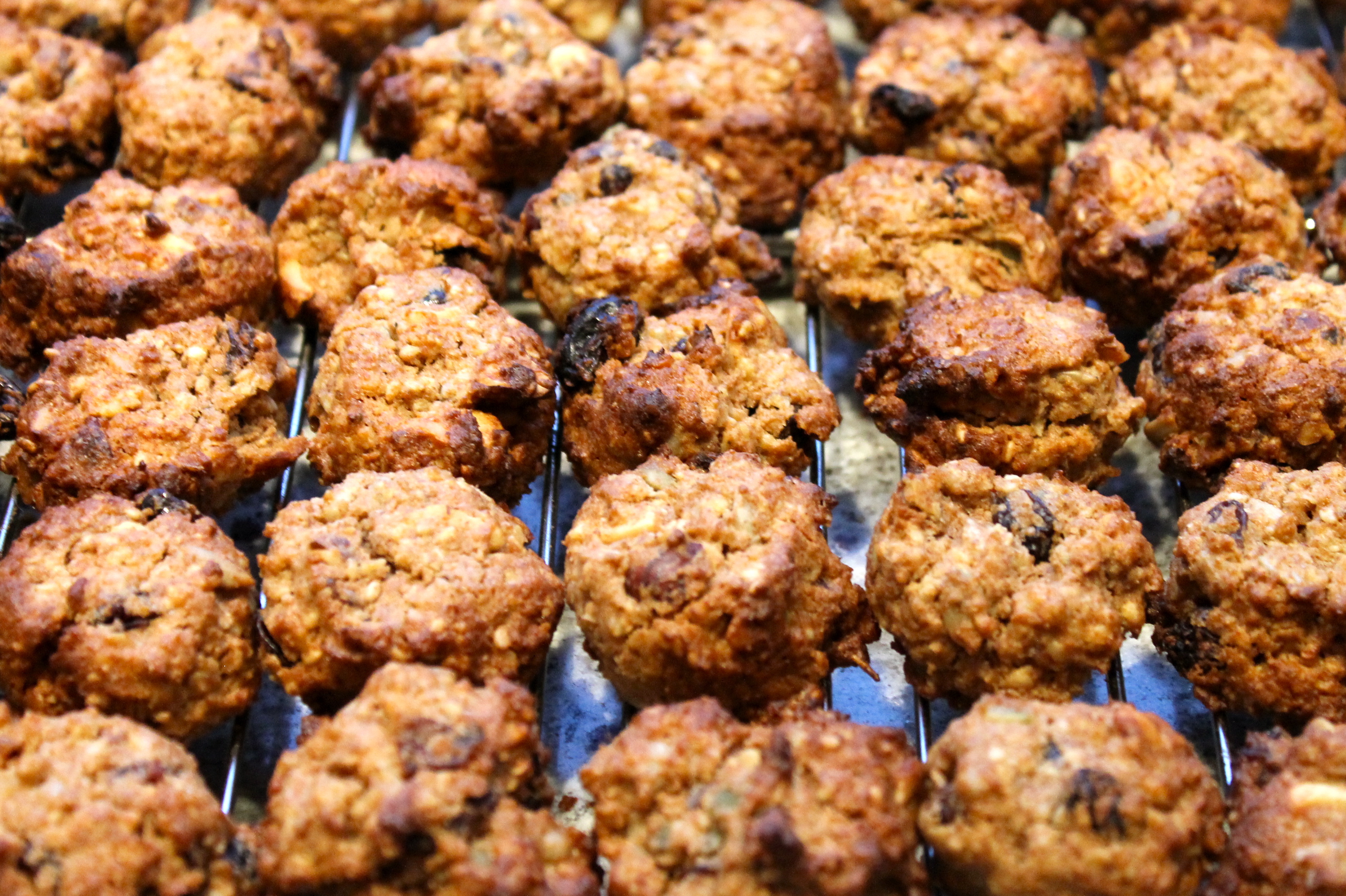 Það má segja að þessi uppskrift sé í hollari kantinum, full af grófu mjöli, hnetum og fræjum og sykurinnihaldið í lágmarki. Uppskriftin er fremur stór, úr henni fást um það bil 100 kökur. Innihaldslistinn er langur og getur virkað flókinn, en með því að taka allt til áður en maður byrjar baksturinn þá verður verður þetta ekkert mál.