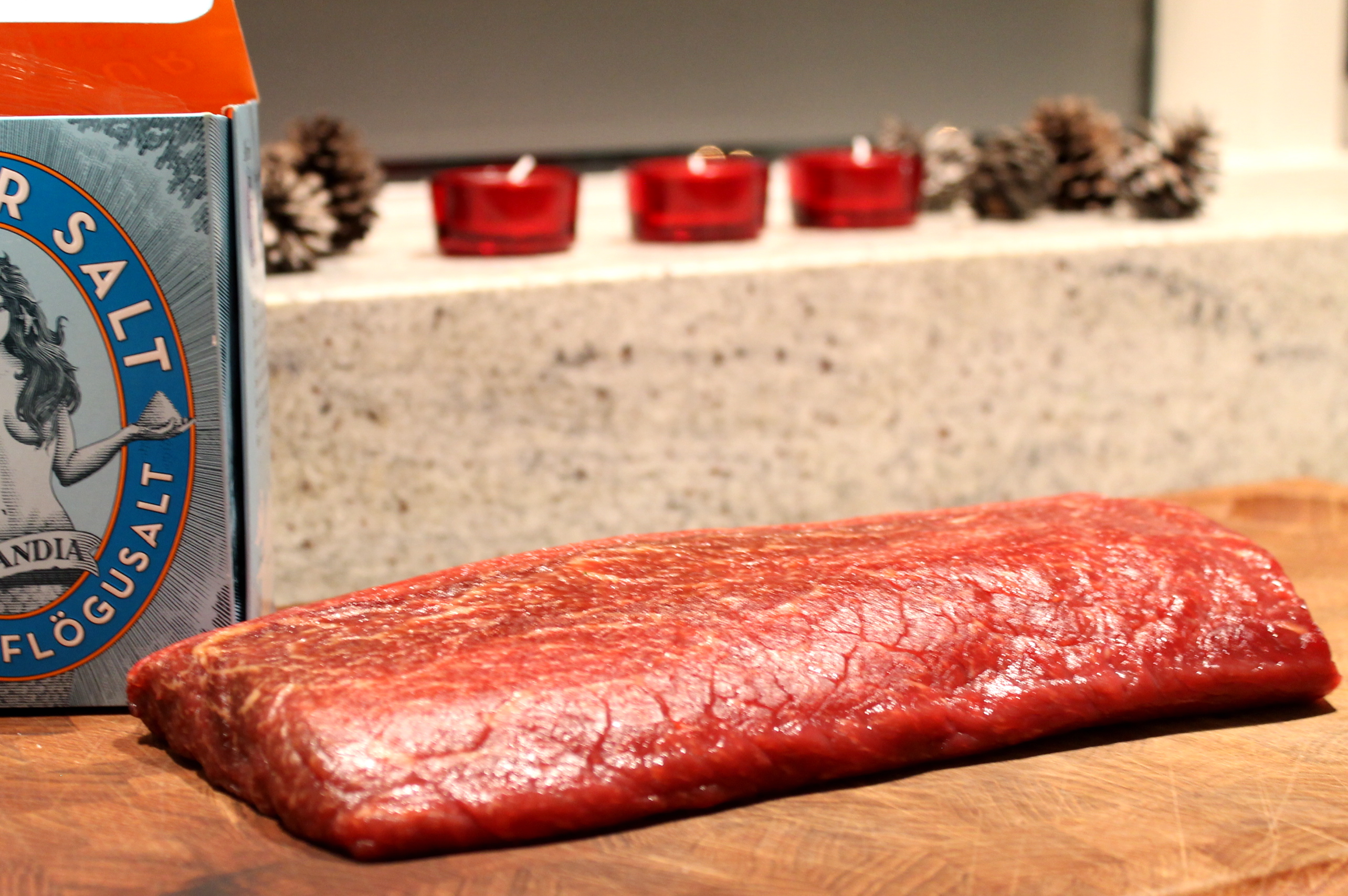 Dreifið grófu og góðu salti vel yfir kjötið – það verður að þekja vel í saltinu. Geymið í kæli í 2 – 3 klst. Skolið þá saltið af kjötinu og þerrið vel með hreinum klút.
