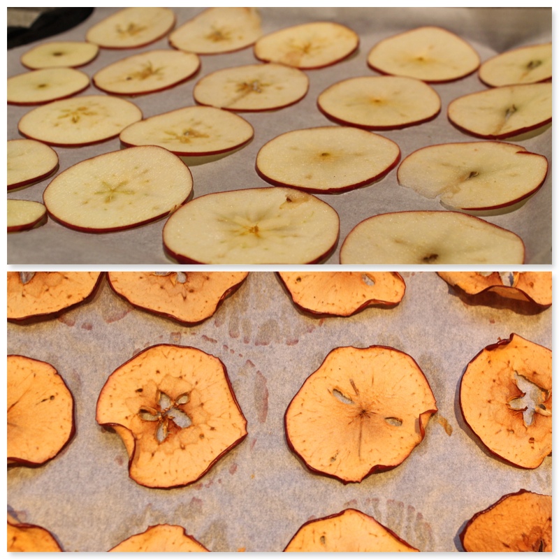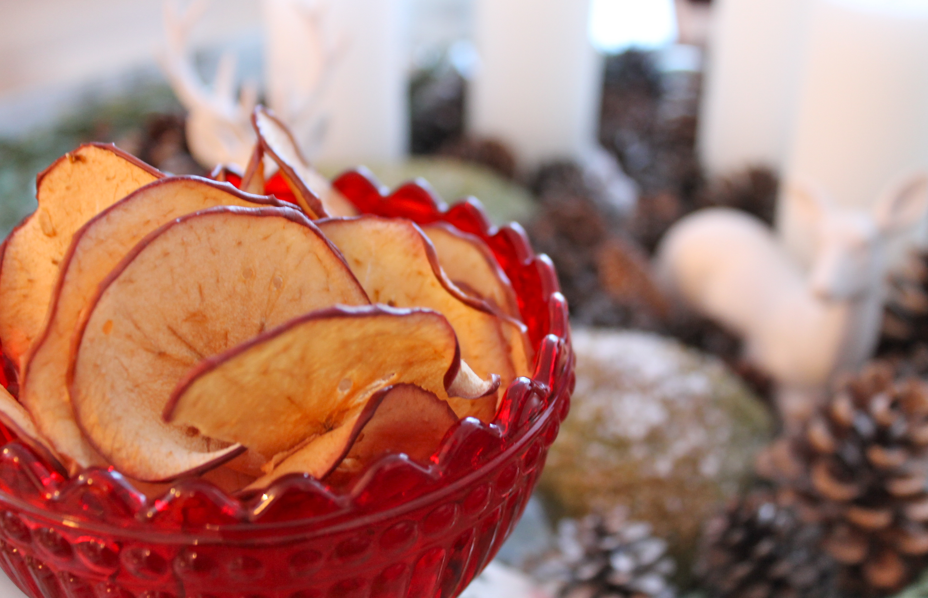 Það er alltaf gaman að prufa eitthvað nýtt – í síðustu viku prufaði ég að skera stór, rauð og sæt epli niður í örþunnar sneiðar og þurrka í bakaraofninum. Ég notaði eplin sem við þekkjum sem jólaepli, ilmandi, safarík og falleg. Útkoman er afbragð, jólalegt og hollt snakk.