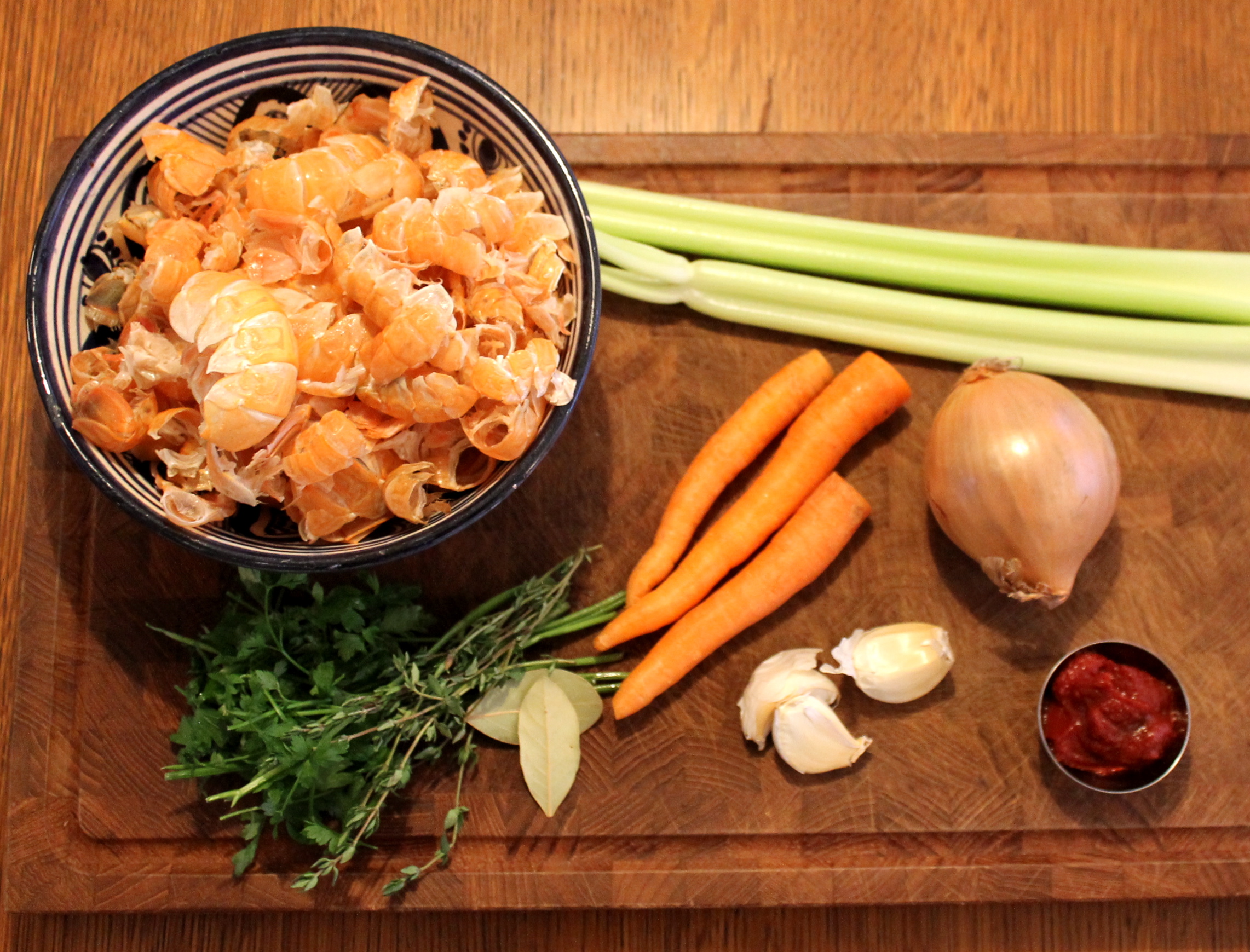 Skelflettið humarinn, geymið humarinn sjálfan í kæli á meðan soðið er útbúið. Saxið lauk, sellerý, gulrætur,hvílauk og chili gróft. Hitið smjör og olíu í góðum potti og steikið grænmetið í nokkrar 5 – 10 mínútur eða þar til það fer að mýkjast vel. Hækkið aðeins hitann undir pottinum og bætið humarskelinni út í. Steikið humarskelina þar til þær fara að brúnast. Bætið tómatmaukinu út í pottinn og hrærið vel. Þá er hvítvíninu helt út í og suðunni leyft að koma upp á víninu, bætið þá vatninu út í pottinn og loks kryddinu.  Látið suðuna koma upp og fleytið froðuna ofan af. Lækkið þá hitann og látið krauma við vægan hita í 4 – 6 klukkustundir. Sigtið soðið sem nú ætti að vera tæplega 1 lítri og hefur því soðið niður um ríflega helming.