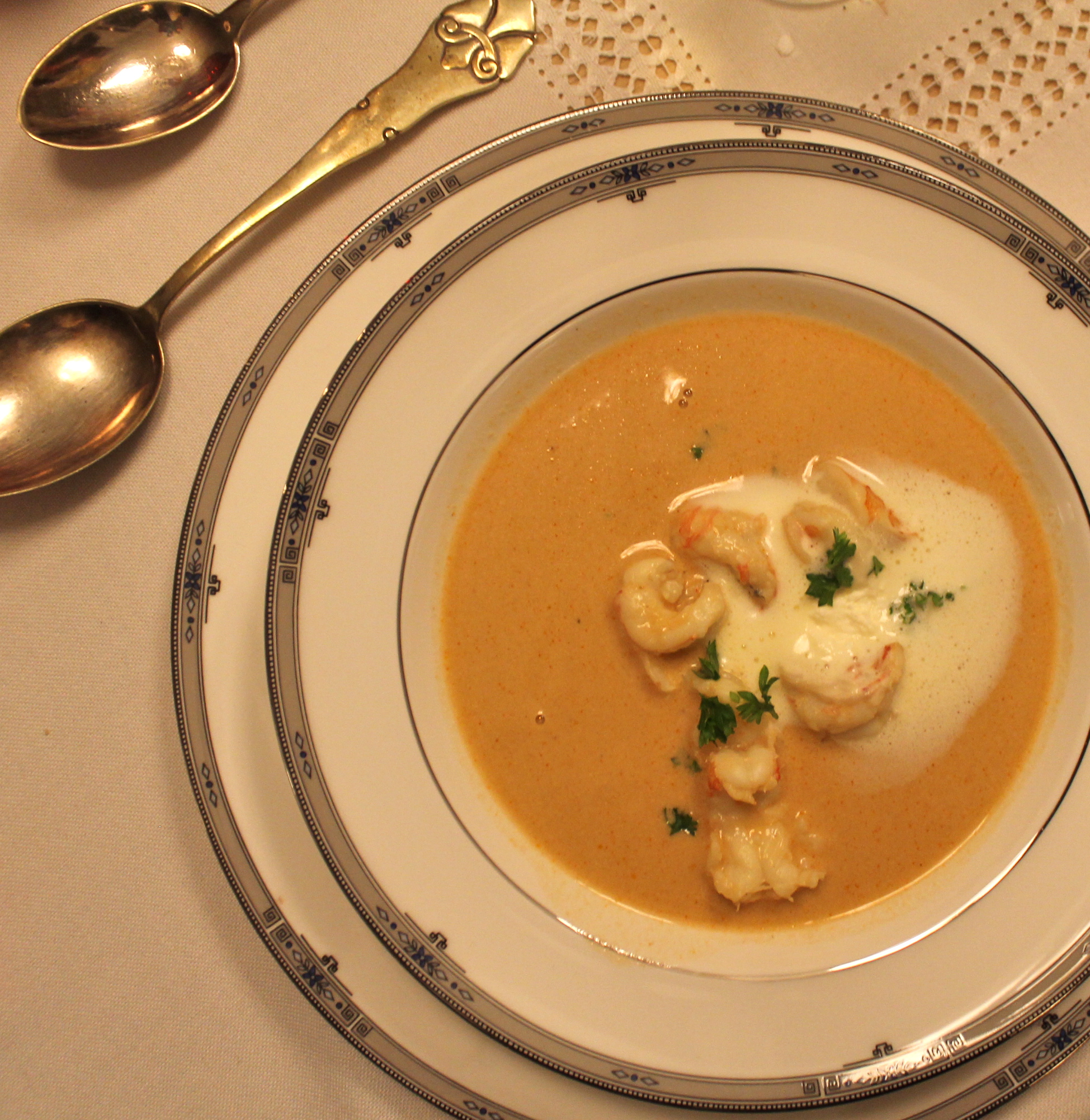 Seinni forrétturinn í ár var ákaflega góð humarsúpa, sem gerð var frá grunni. Humarskel, grænmeti, ferskar kryddjurtir og hvítvín mynda kraftmikið soðið. Þetta er ekki fljótgerð, „instant“ uppskrift, en ég get svo sannarlega fullyrt að fyrirhöfnin er þess virði -allir voru á einu máli um að þetta væri með betri forréttum sem við höfum boðið upp á.