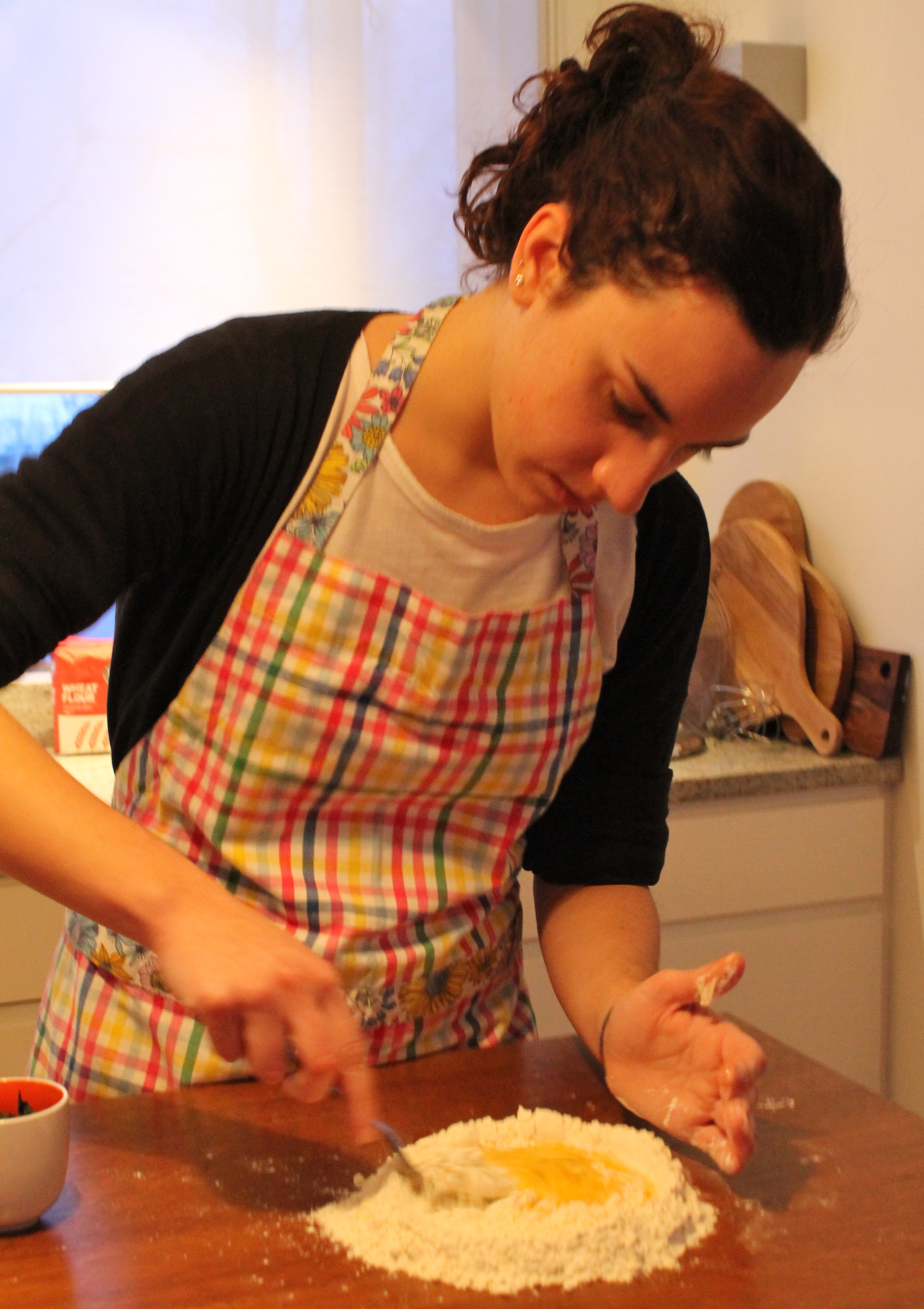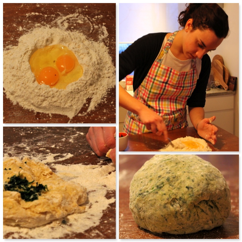 pasta1Blandið saltinu við hveitið og setjið það í haug á borðið, myndið holu í miðjan hauginn og brjótið eggin í holuna. Hrærið hveitinu smátt og smátt saman við eggin, bætið soðnu spínatinu saman við og hnoðið vel.  Gætið þess þó að hnoða deigið ekki of mikið. Setjið deigið í plastpoka eða vefjið plastfilmu utan um það og leyfið því að hvíla í u.þ.b. 30 mínútur eða á meðan fyllingin er útbúin.