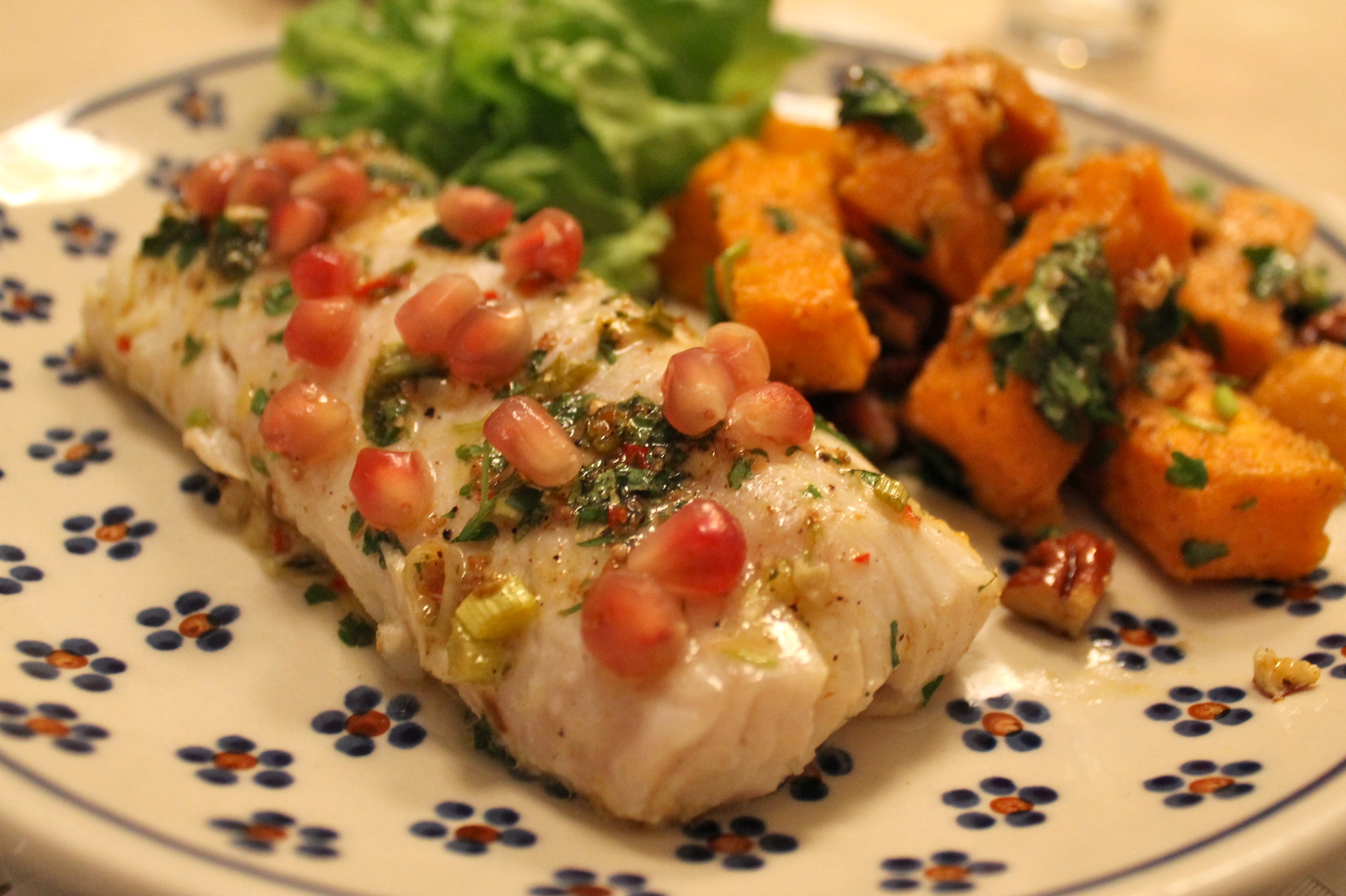 Ristið cumin- og kóríanderfræ á þurri pönnu þar til þau fara að ilma. Setjið í mortél og steytið þegar þau hafa kólnað. Bætið ólífuolíunni og öllu öðru hráefni, nema granateplafræjunum saman við og blandið vel. Smyrjið fisksteikurnar með kryddjurtablöndunni. Setjið í eldfast fat og bakið í ofni við 190°C í u.þ.b. 15 mínútur eða þar til fiskurinn er gegneldaður, en þó alls ekki of mikið. ATH að fiskurinn heldur áfram að eldast í nokkrar mínútur eftir að hann er tekinn úr ofninum. Setjið granateplafræin yfir fiskinn áður en hann er borinn fram.