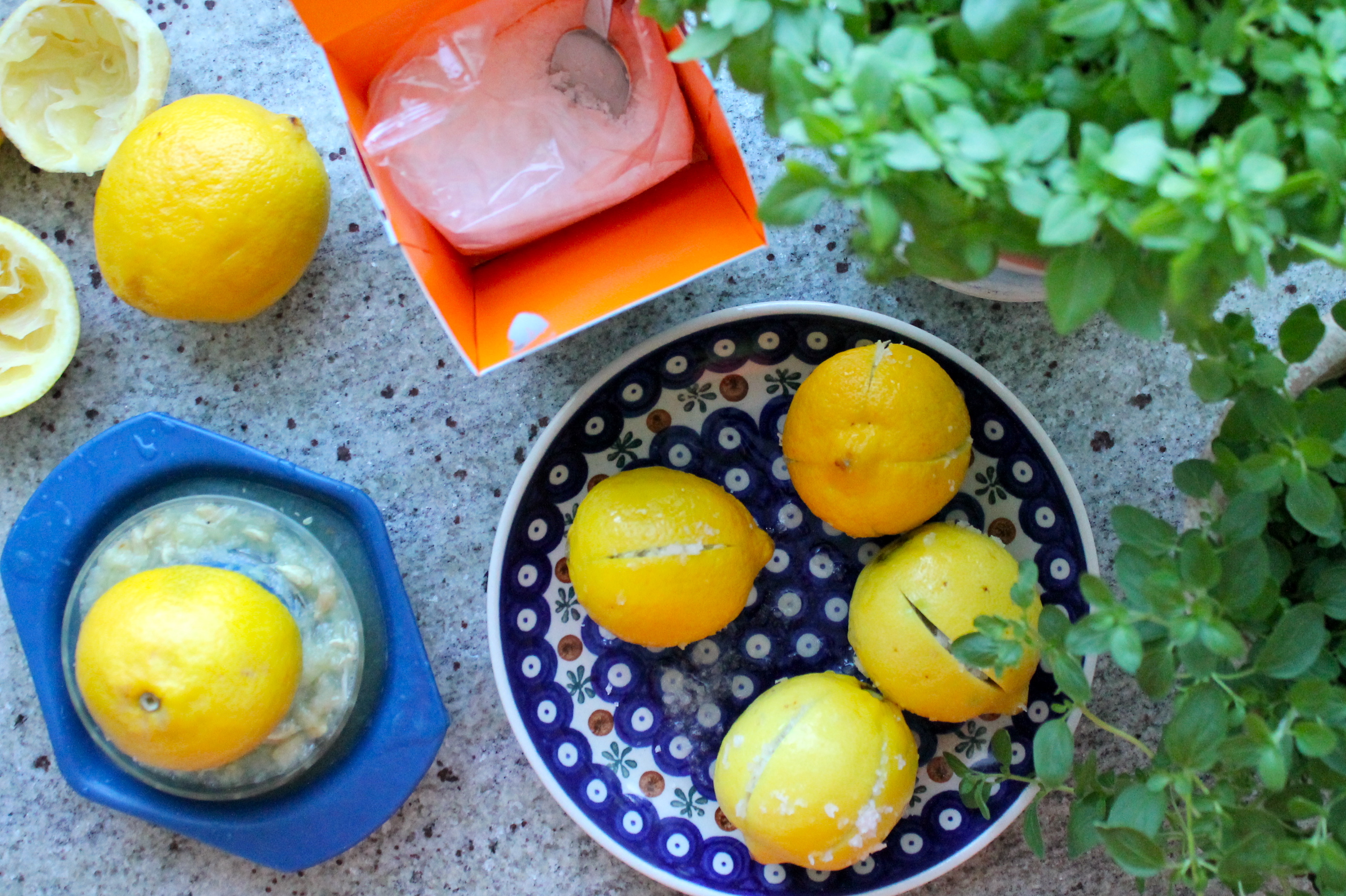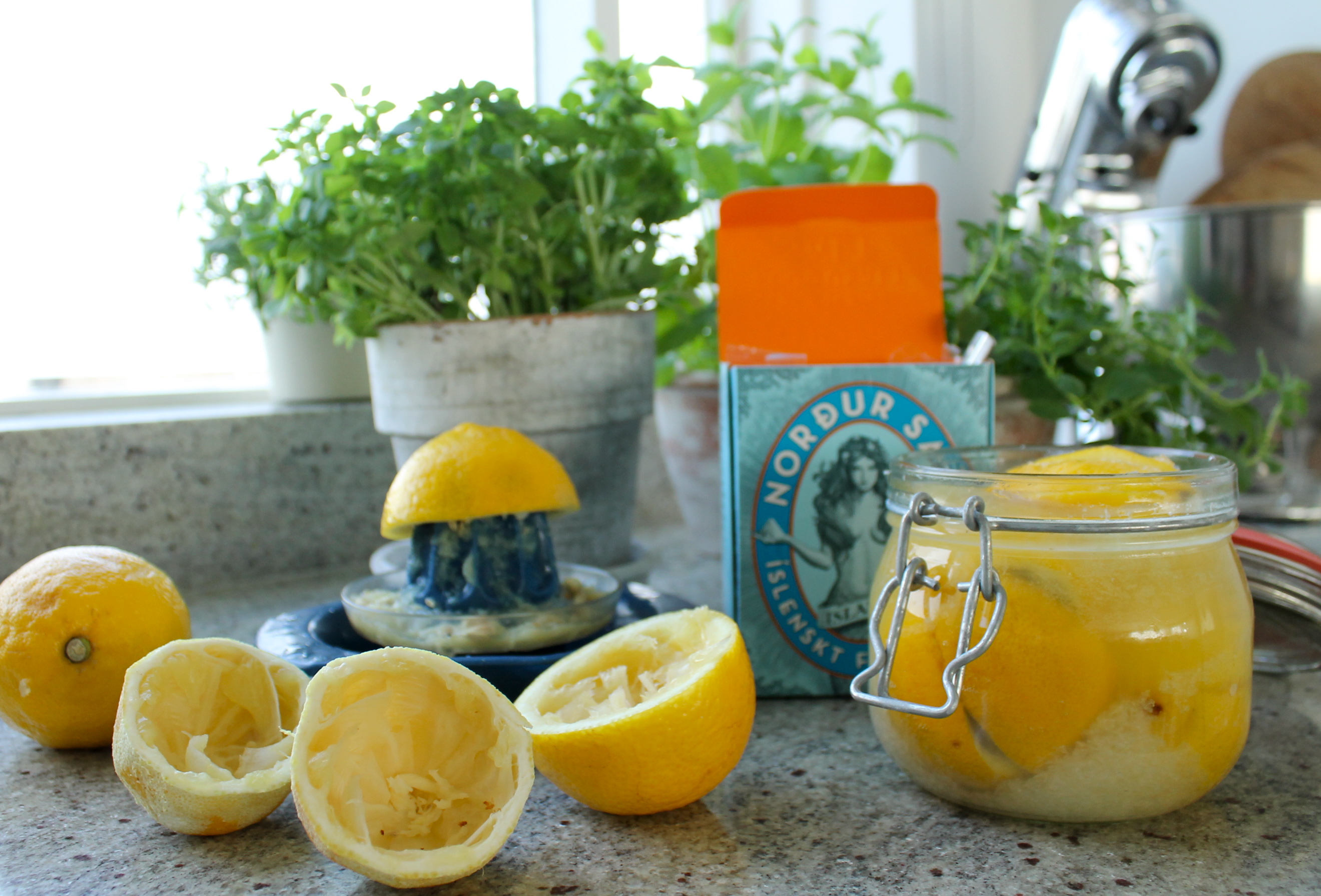 Skerið fjóra djúpa skurði í hverja sítrónu og setjið u.þ.b. 1 tsk af salti í skurði hverrar sítrónu. Setjið sítrónurnar í sótthreinsaða krukku og þrýstið á þær. Setjið afganginum af saltinu ásamt sítrónusafa yfir sítrónurnar í krukkunni, þannig að það fljóti aðeins yfir þær. Geymið krukkuna á köldum og dimmum stað í u.þ.b. 4 vikur. Nokkrum sinnum á tímabilinu er ágætt að snúa krukkunni nokkrum sinnum til að hreyfa aðeins við saltinu, svo það þekji sítrónurnar öugglega vel.