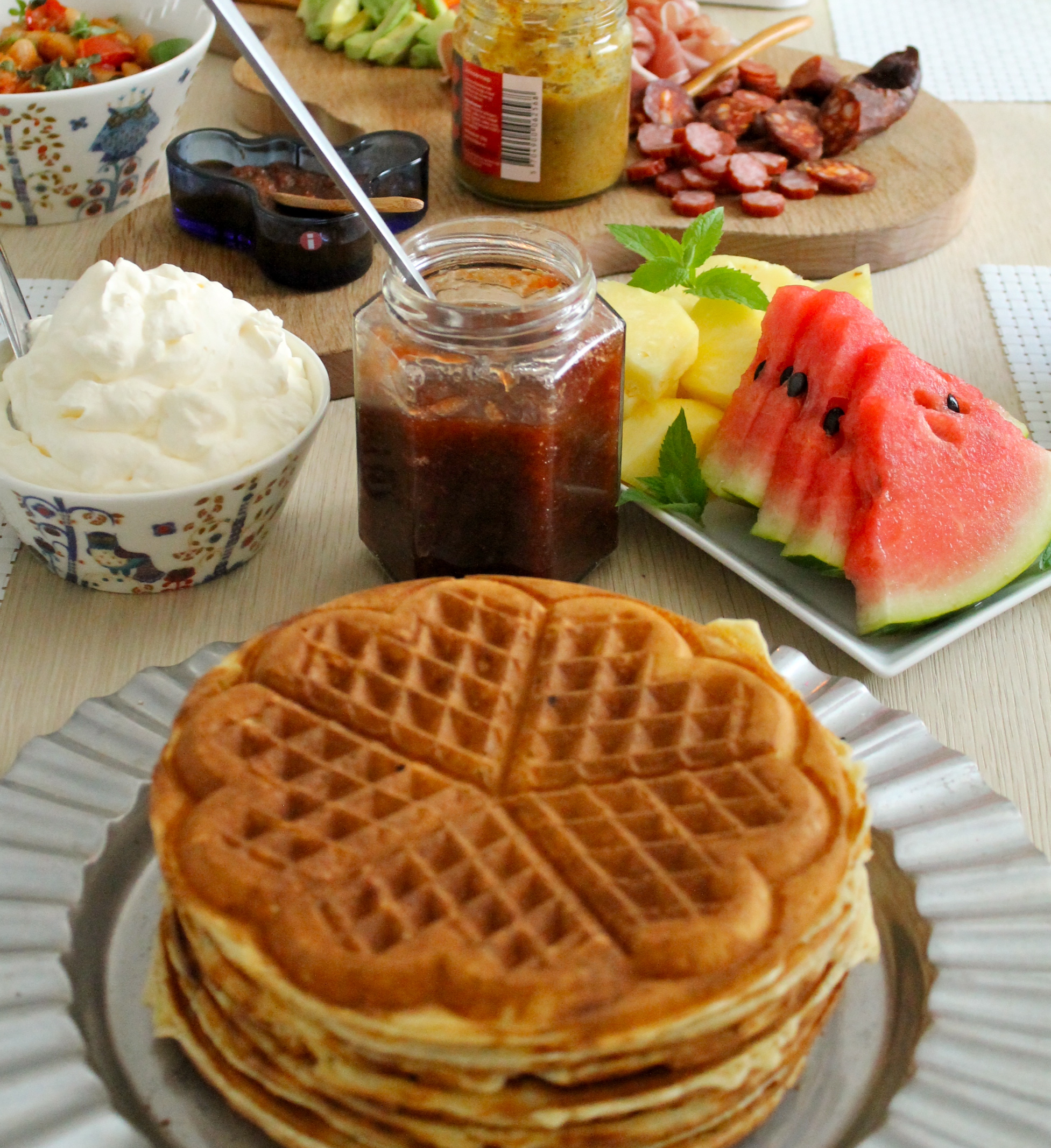 Sunnudagar eru fjölskyldudagar og ávalt ljúft og gott að hitta fólkið sitt, fara yfir málefni líðandi stundar, skiptast á sögum, skoðunum, viðburðum og plana komandi daga, vikur og jafnvel mánuði. Eins og svo oft áður var síðbúin árdegisverður í Vatnsholtinu og í þetta sinn voru vöfflur sæti bitinn á borðinu. Vöfflur þessar hafa þróast upp úr nokkrum gömlum og góðum uppskriftum. Þær eru stökkar og góðar. Kardemommurnar gefa þeim dásamlegt tvist og treystið mér, nýsteyttar kardemommur gera svolítinn galdur í þessari uppskrift.