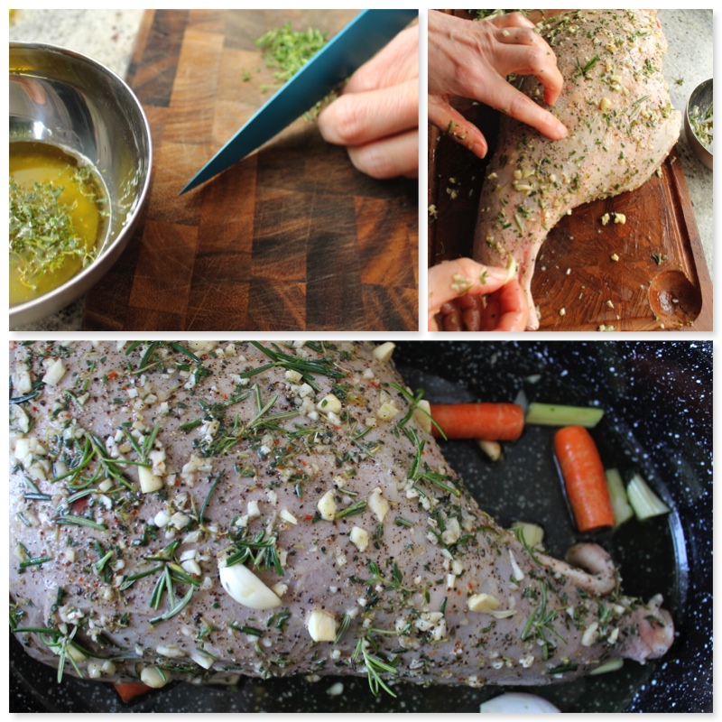 Byrjið á að snyrta lærið og stinga litlum hníf í það á nokkrum stöðum, kannski 12-14 stungur. Takið 4-6 hvítlauksgeira og skerið þá í 2-3 parta eftir endilöngu, troðið hvítlauksgeira ásamt 2-3 laufum af rósmarín í hverja stungu á lærinu. Merjið afganginn af hvítlauksgeirunum undir hnífsblaði og skerið smátt. Saxið rósmarín og tímían smátt og blandið ásamt hvítlauknum við olíu og sítrónusafa. Kryddið vel með salti, pipar og svolitlu af chiliflögum. Nuddið lærið vel upp úr blöndunni og leyfið að marenerast í nokkrar klukkustundir eða yfir nótt.