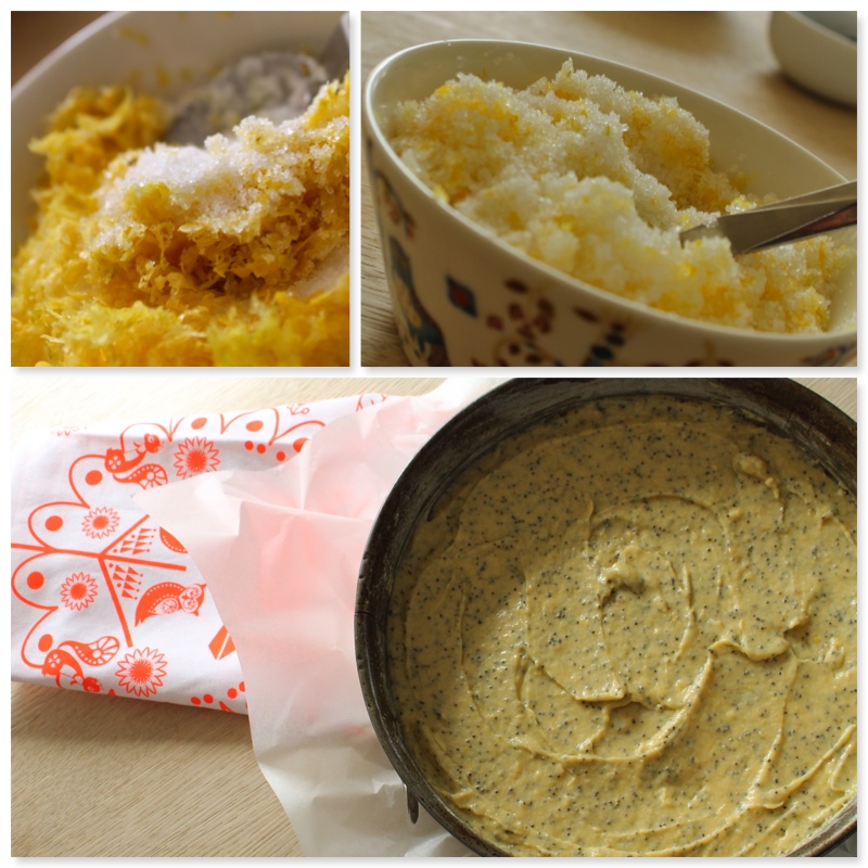Á meðan marensinn bakast er tertubotninn útbúinn. Byrjið á að þeyta smjörið þar til það er ljóst og létt. Rífið ysta lagið af sítrónunni og blandið saman við sykurinn, hrærið sítrónusykurinn saman við smjörið og bætið síðan eggjunum saman við einu í einu. Sigtið hveit og lyftiduft og bætið út í. Þá er sítrónusafanum hrært saman við og loks birkifræjunum. Hækkið ofnhitann í 170°C og bakið tertubotninn í velsmurðu springformi í 25-30 mínútur eða þar til prjónn sem er stungið í kökuna miðja kemur hreinn út.