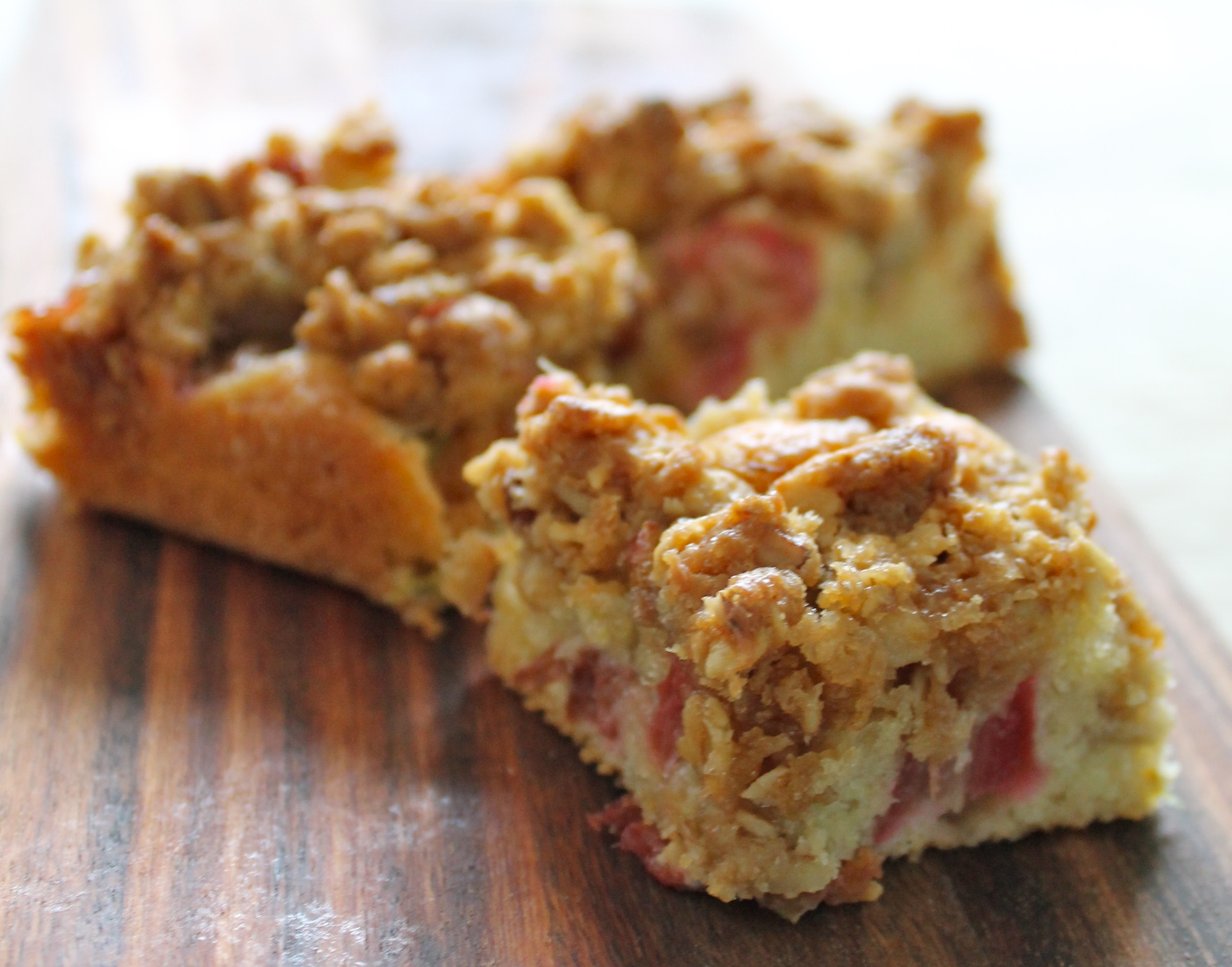 Ég kom heim með fullan poka af rabarbara í gærkvöldi og ætla að búa þessa skúffuköku til strax 🙂 Þetta er girnilegasta rabarbaraskúffukaka sem ég hef séð!