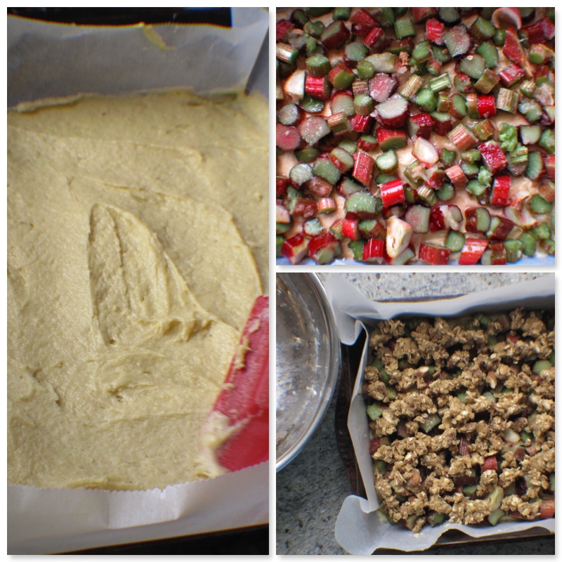 Dreifið rabarbarafyllingunni yfir deigið og stráið loks haframjölsmylsnunni ofan á.