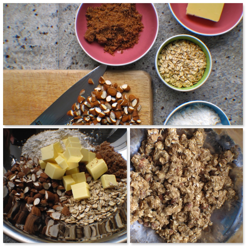 Setjið þurrefnin og möndlurnar sem fara í lokið á fyllinguna í skál, skerið smjörið í litla bita og hrærið saman við þurrefnin þar til blandan er eins og gróf mylsna.