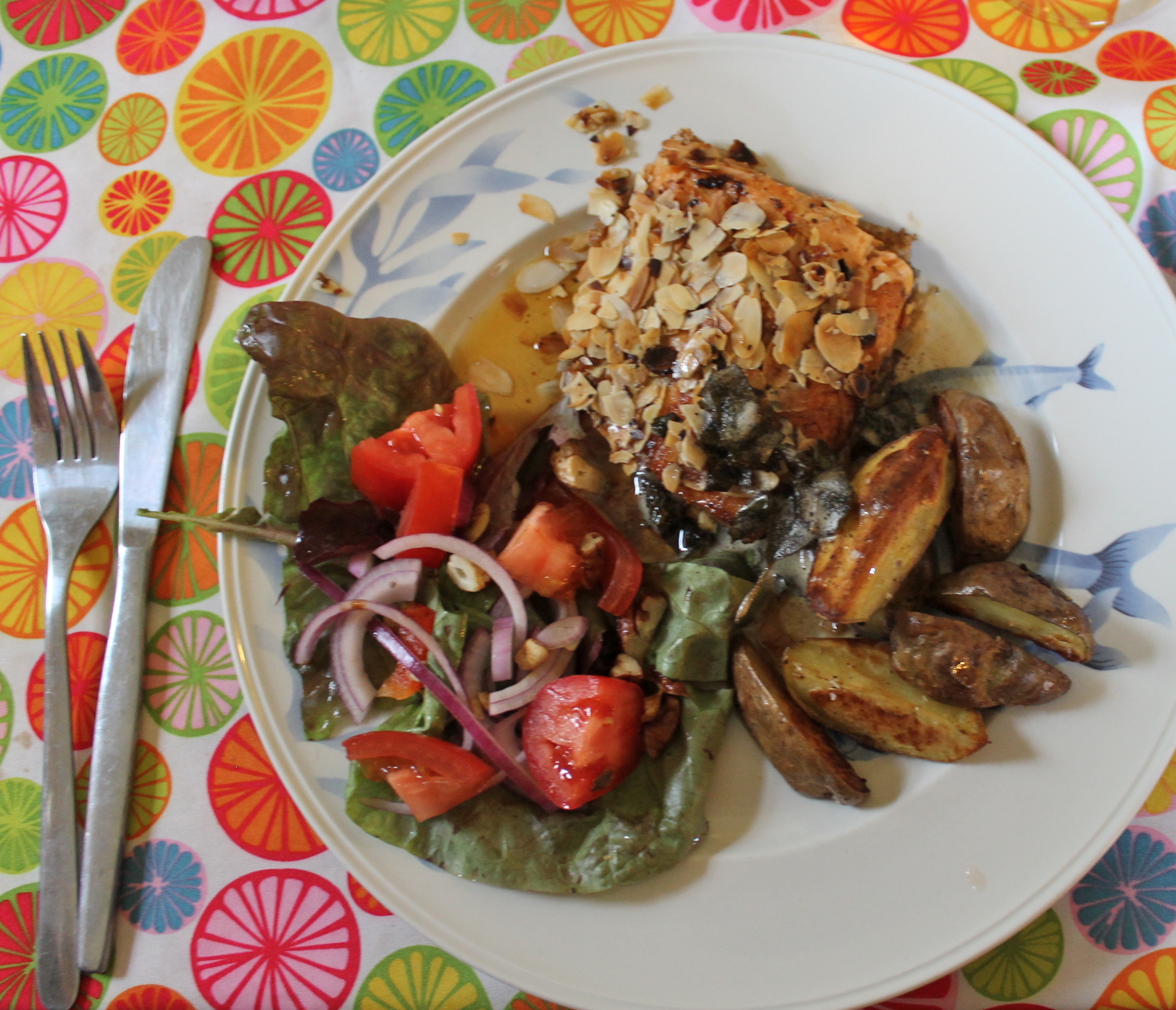 Meðlætið er einfalt, gott ferskt salat og bakaðir kartöflubátar eða nýjar íslenskar soðnar kartöflur.