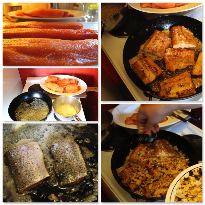Bræðið smjörið á pönnu og bætið smávegis af jurtaolíu út í til að smjörið brenni síður. Steikið fiskinn fyrst á roðlausu hliðinn í nokkrar mínútur, kryddið með salti og pipar, snúið við og steikið á roðhliðinni í nokkrar mínútur (fer eftir stærð og þykkt stykkjanna, en 3-5 mínútur á hvorri hlið er nær lagi). Stráið möndluflögum yfir silunginn á pönnunni og berið fram.