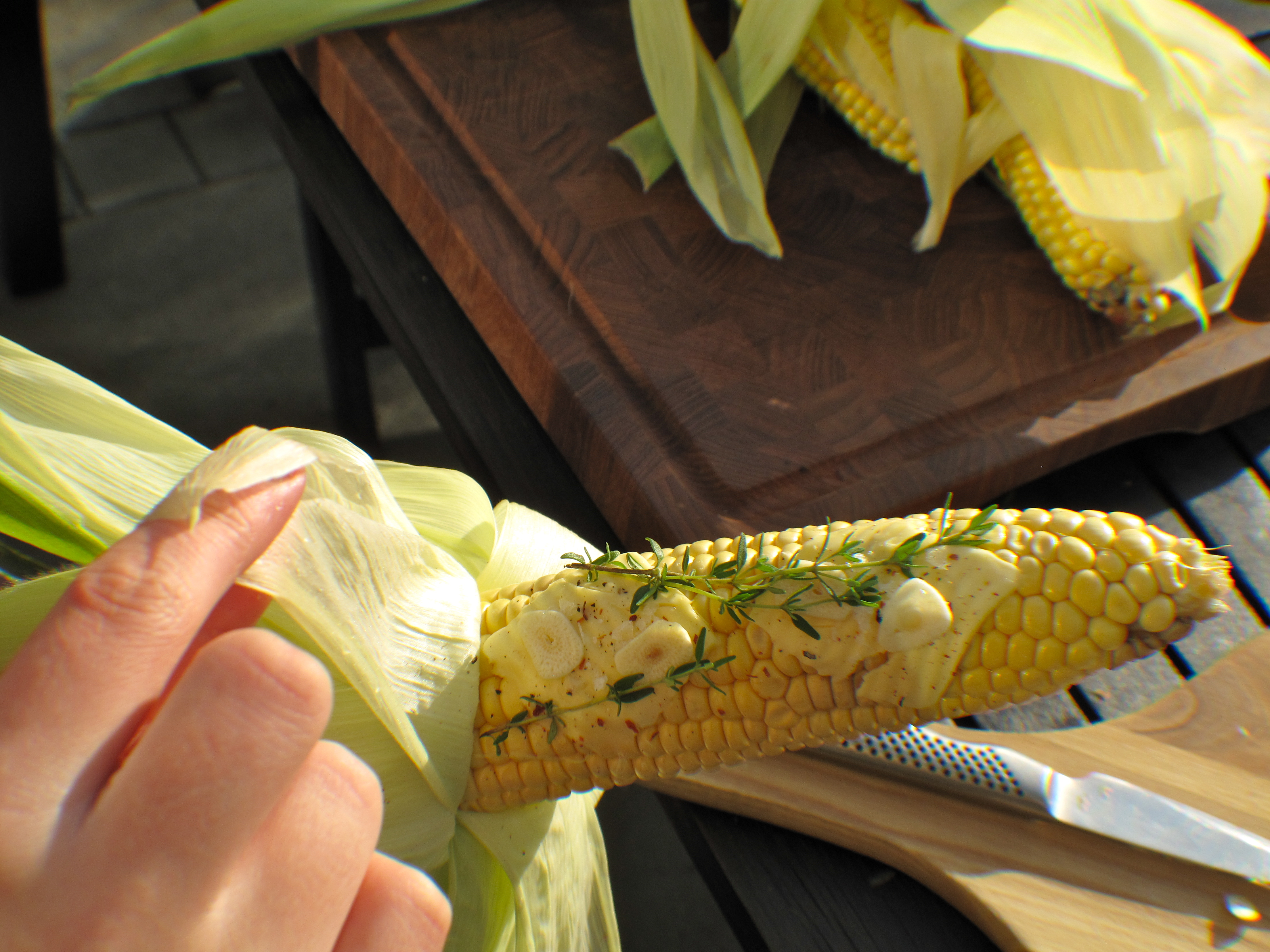 En að öðru – þegar við grilluðum þennan maís, var óskaplega gott veður, öll fjölskyldan í mat og allir hjálpuðust að við að elda og dekka upp fallegt borð út á palli. En þrátt fyrir að myndirnar sem hér eru birtar séu fallegar og maísinn vel heppnaður þá gekk raunar allt á afturfótunum þegar við elduðum þetta kvöld. Þegar við loks settumst niður, höfðum náð að taka fallegar myndir af því sem þó heppnaðist og það sem best var náð að halda húmornum og góða skapinu þrátt fyrir allt brasið, mistökin og slysin sem áttu sér stað….. ræddum við hvað það væri nú verið fyndið ef við hefðum tekið myndir af misheppnuðu sósunni sem vildi ómögulega verða eins og hún átti að vera eða mynd af fallega kryddstauknum með dásamlega uppáhalds ítalska kryddinu mínu sem endaði í þúsund molum á stéttinni, eða sætu kartöflunum sem brunnu aðeins…… Næst munum við mynda mistökin og setja í sérstaka færslu – það er ef við náum að hafa húmorinn að leiðarljósi eins og þetta kvöld 🙂