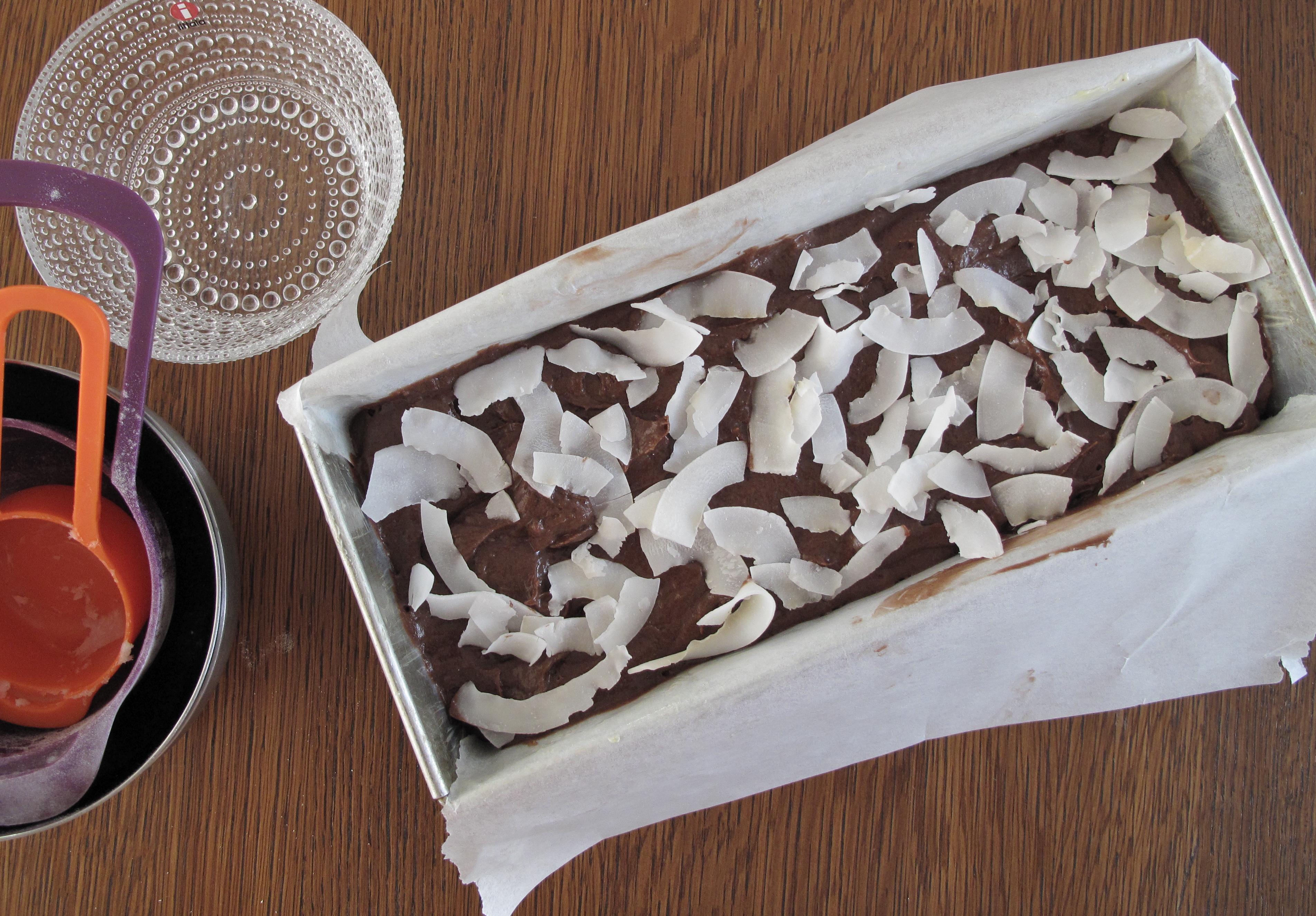 Það er ákaflega viðeigandi á sunnudögum að skella í eina formköku og kalla fjölskyldu og vini í kaffi. Þegar ég las uppskrift af köku svipaða þessari á vefnum hjá Bon Appetit fyrir nokkru var ég staðráðin í að þessa þyrfti ég að baka – súkkulaði og kókos eru hvoru tveggja í uppáhaldi. Ég breytti uppskriftinni örlítið og aðlagaði að smekk og því hráefni sem til var. Útkoman er hin besta sunnudagskaka með góðu kaffi eða ískaldri mjólk. Held ég baki þessa köku fljótlega aftur, ef til vill strax um næstu helgi og taki þá með í berjamó ef veður leyfir slíka útiveru 🙂
