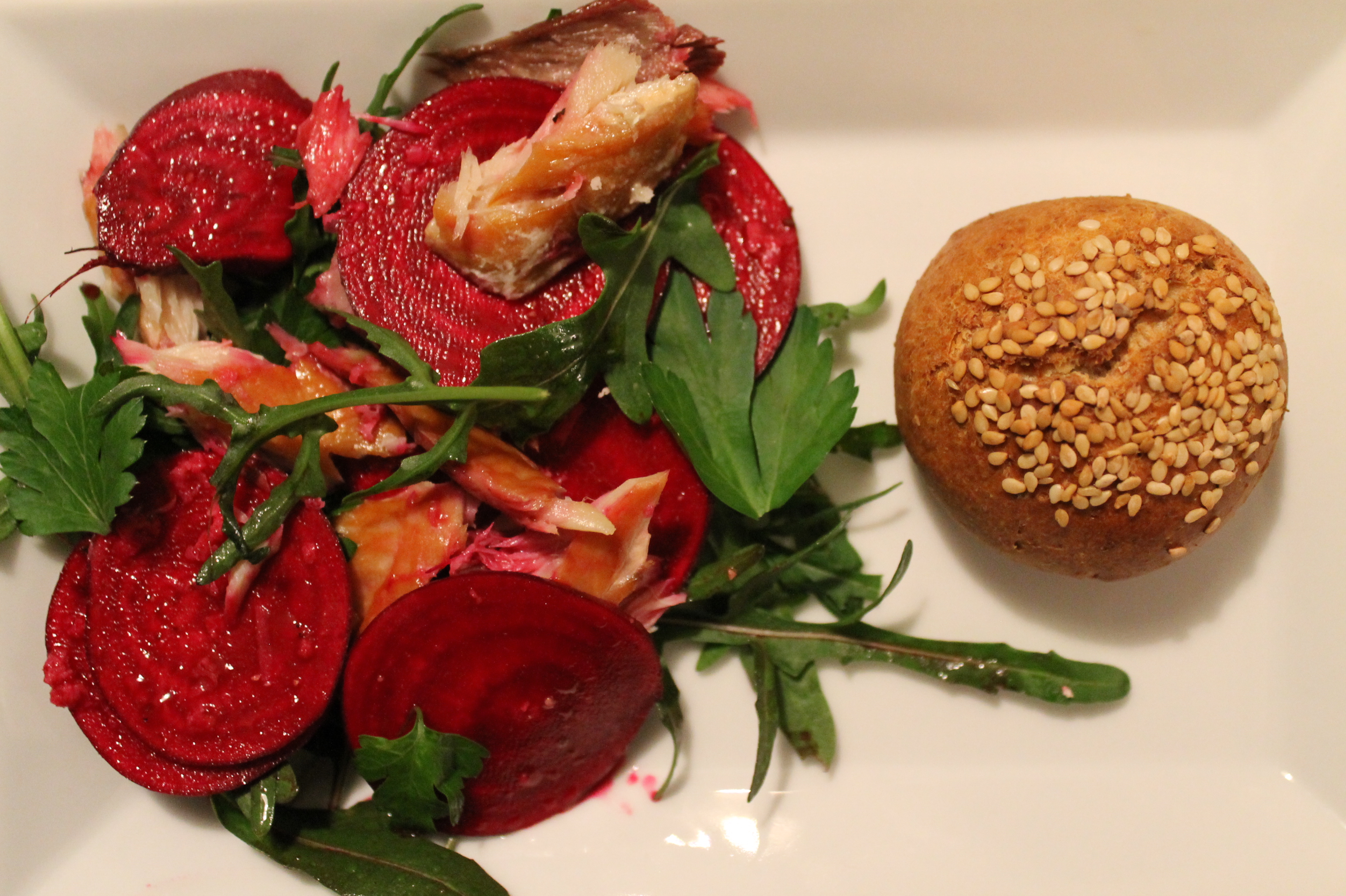 Annasamir dagar kalla á léttan og fljótlegan kvöldverð. Í kvöld sagði þreytan, já og letin aðeins til sín. Ég nennti ómögulega að hafa mikið fyrir matarstússi og það þrátt fyrir að það sé laugardagskvöld. Um tíma var ég meira að segja að spá í hvort við myndum bara láta freistast í keyptan skyndibita…… en ákvað svo að trítla út í garð ná í tvær rauðrófur, ég átti heitreyktan makríl sem ég keypti á matarmarkaðnum í Hörpu síðustu helgina í ágúst og ola – úr varð þessi dásemd. Hreint ekki galið – fljótlegt, holt og gott.