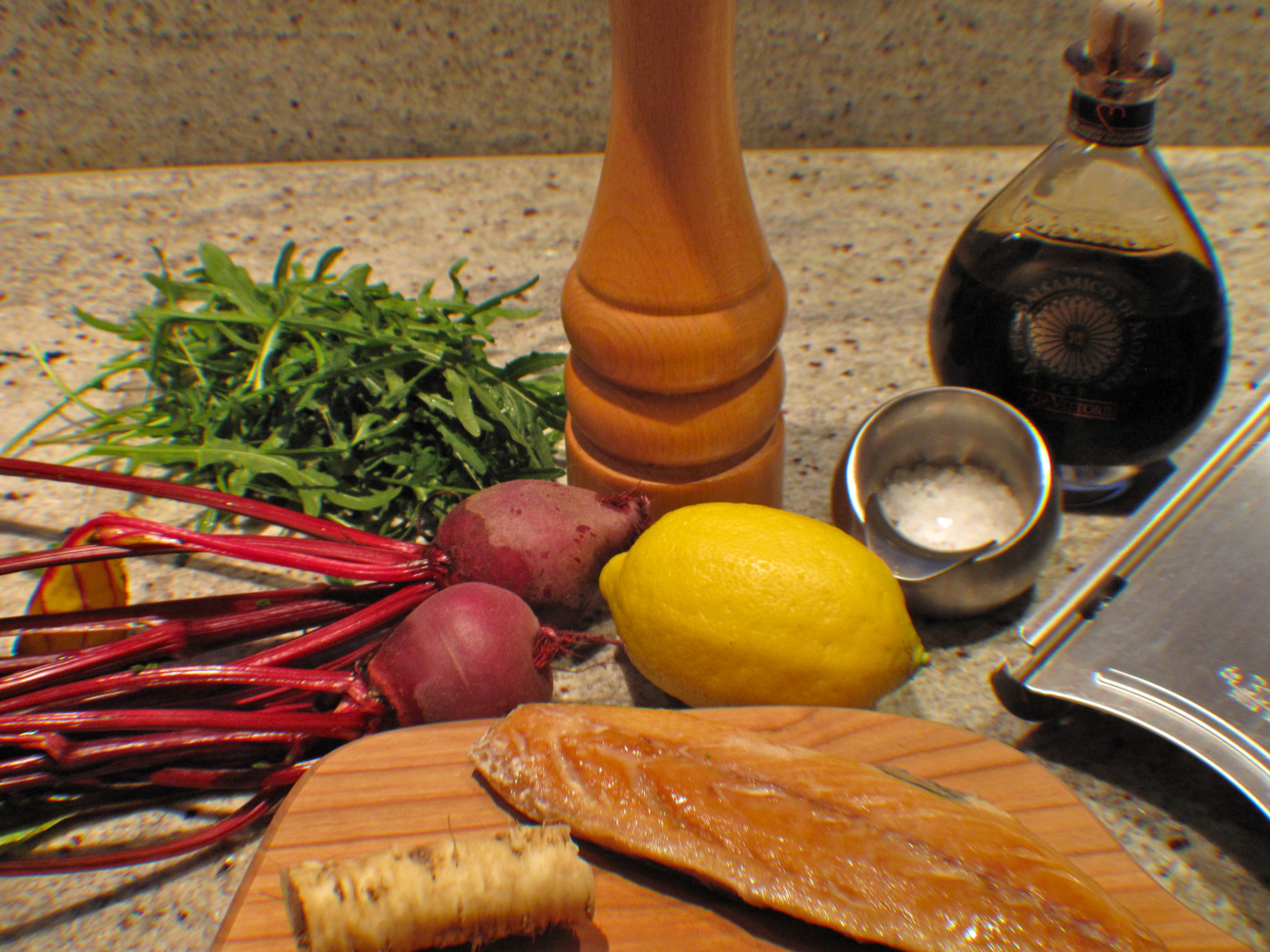 Setjið klettakál á disk, raðið rauðrófusneiðunum yfir. Rífið heitreykta makrílinn í hæfilega bita og raðið yfir rauðrófurnar. Rífið piparrótina mjög fínt yfir alls saman og stráið nokkrum blöðum að steinselju yfir.