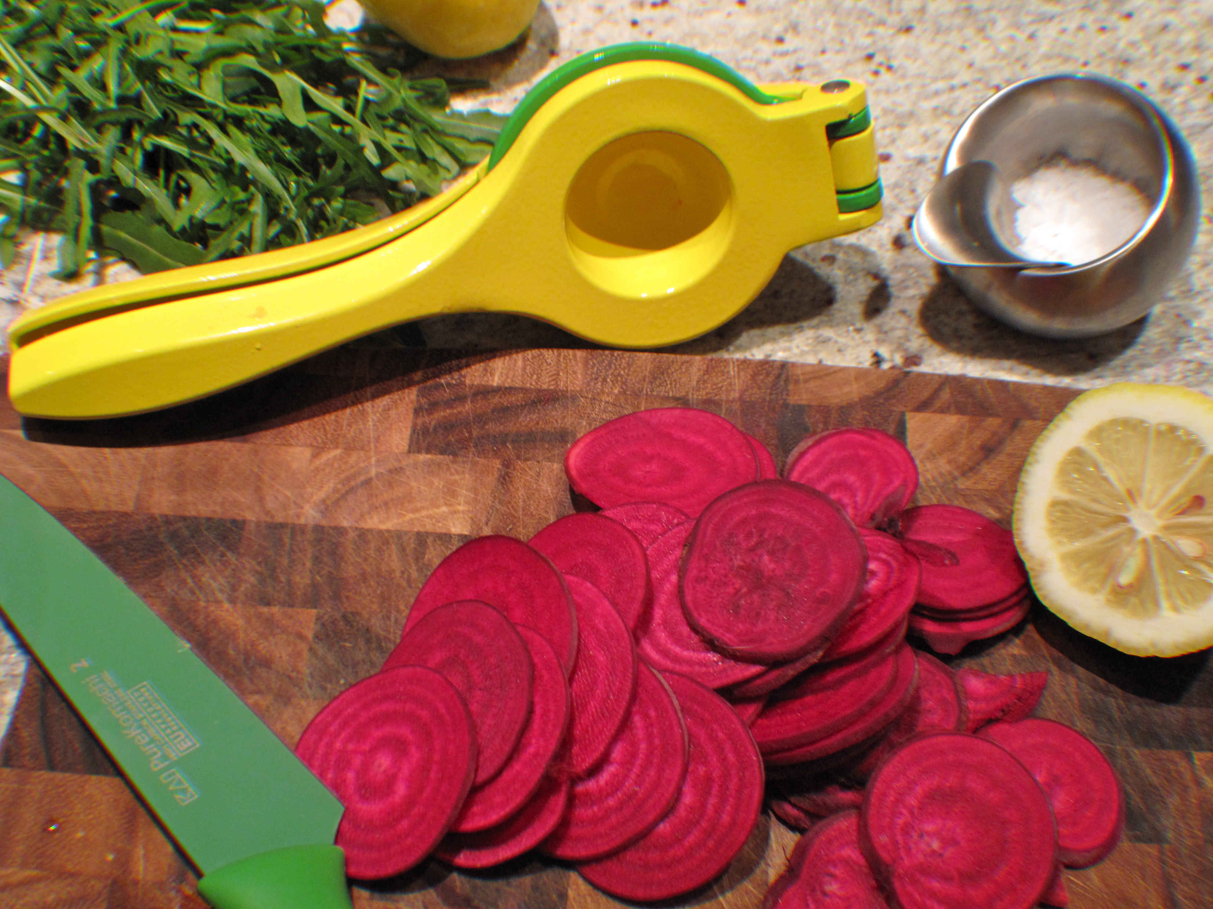 Þvoið rauðrófurnar, skrælið ef þörf er á og sneiðið í örþunnar sneiðar.