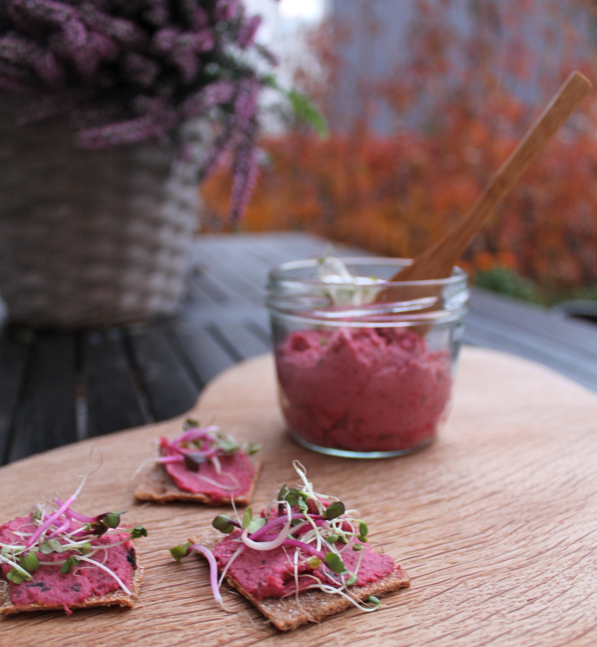 Ég hef nokkrum sinnum áður montað mig af garðinum mínum, en hann er ástæða þess að ég keypti íbúðina mína fyrir réttum 10 árum. Í þessum dásemdargarði er nefninlega ágætis aðstaða til að rækta smávegis af grænmeti og kryddjurtum sem við nýtum og njótum til hins ítrasta. Í sumar ræktaði ég nokkrar rauðrófur, þær eru hvorki margar né stórar en þeim mun betri. Tvær fóru í þetta salat hér, tvær í þetta dásemdarhummus og þá eru um það bil fjórar eftir enn úti í garði – ef til vill baka ég þessa súkkulaði- og rauðrófuköku um næstu helgi.