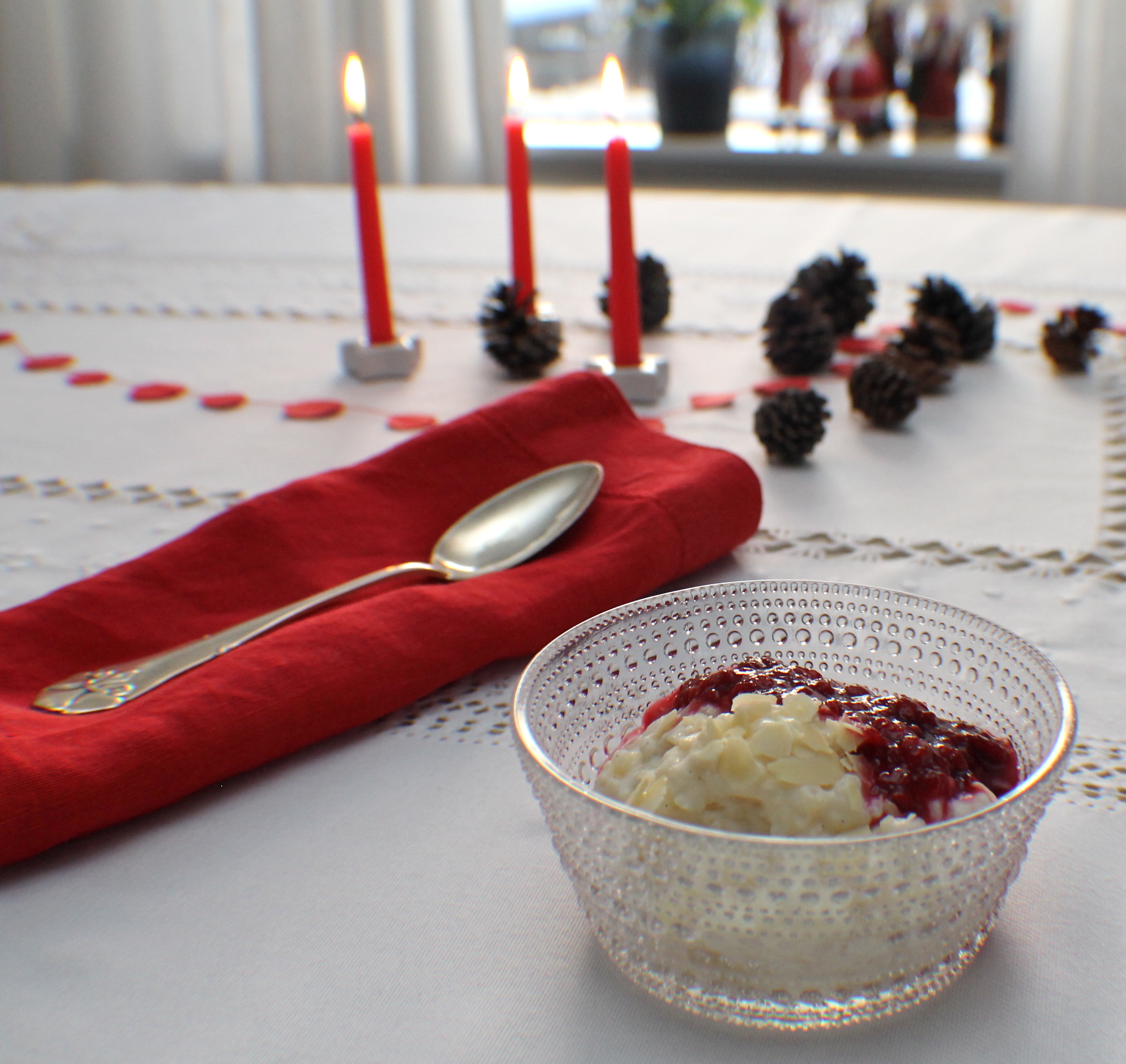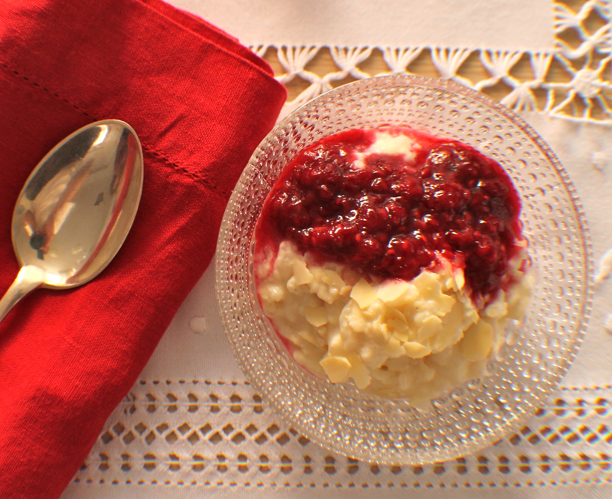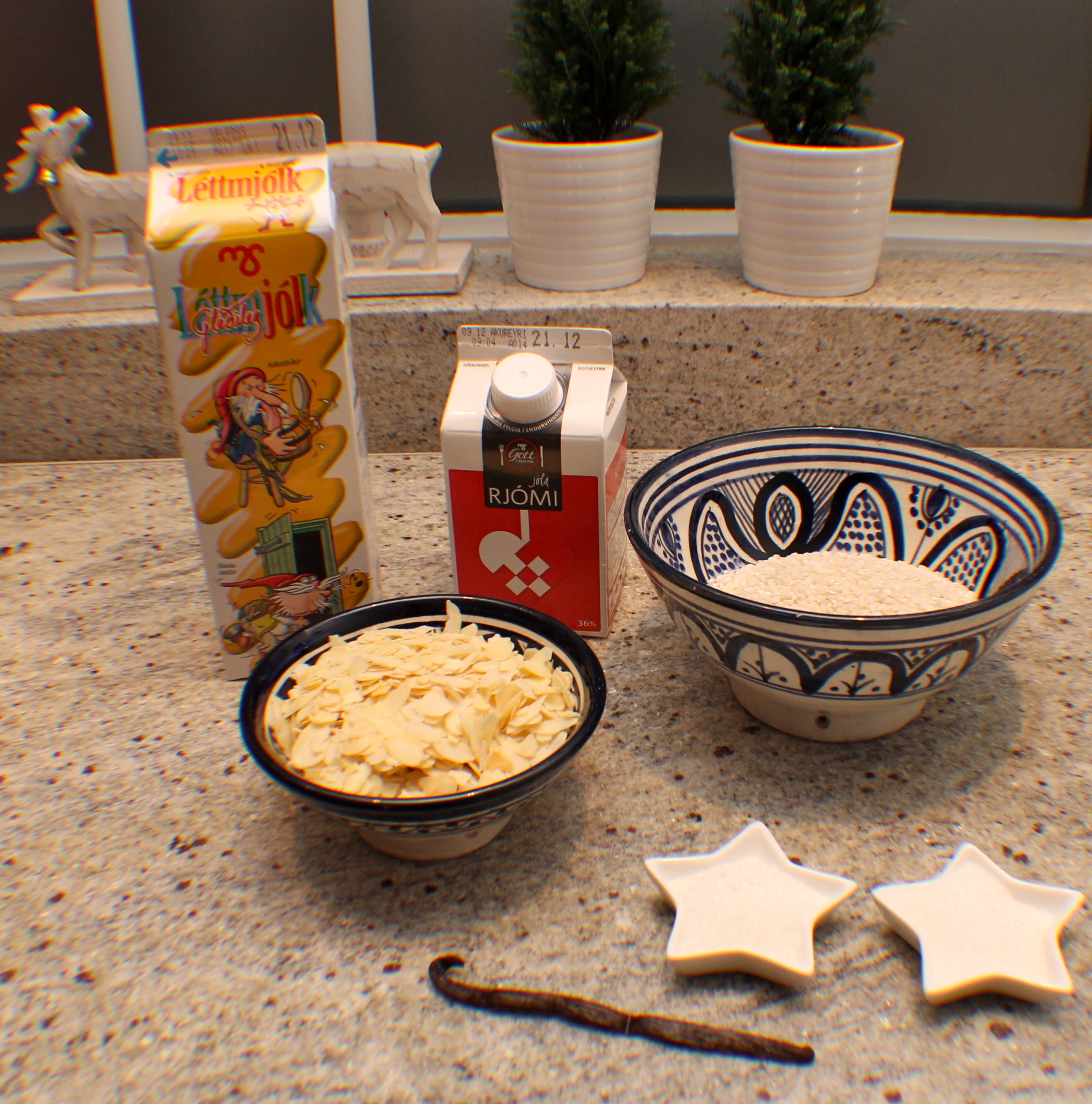 Ris a l’amande er ómissandi á jólum – nafnið er franskt og þýðir einfaldlega hrísgrjón með möndlum. Rétturinn er hins vega hingað kominn frá Danmörku þar sem hann hefur verið þekktur í það minnsta í tvær aldir skv. heimildum mínum sem að sjálfsögðu eru fengnar úr Matarást hennar Nönnu Rögnvaldardóttur. Uppskriftin sem hér birtist hefur hins vegar þróast hjá okkur síðustu árin og tímabært að beita sig aga, mæla nákvæmlega og skrá hana 🙂 Ris a l’amande er eftirréttur en við höfum þennan rétt í hádeginu á aðfangadag – uppskriftin er frekar stór og því er yfirleitt smávegis afgangur sem gott er að læðast í á jóladag eða annan í jólum. Að sjálfsögðu setjum við eina heila möndlu í grautinn og sá sem hana fær hlýtur möndlugjöfina sem í okkar fjölskyldu hefur undanfarin a.m.k. 10 ár verið borðspil og/eða viðbætur við borðspilin sem til eru – við eigum því orðið gott úrval af borðspilum sem gaman er að spila um jólin 🙂